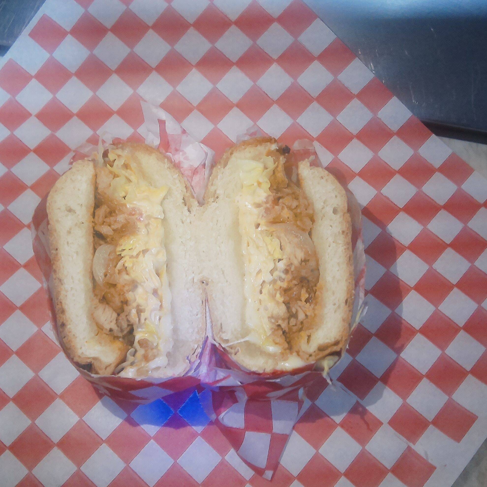 Doble de pollo, mayonesa, cebolla, letchuga, jitomate, aguacate, pepinillos y aderezo especial de la casa