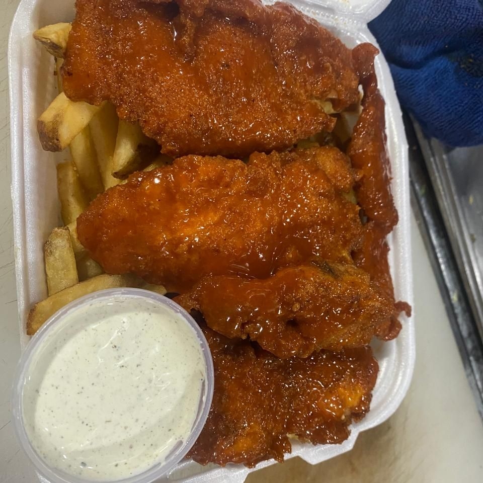 Tiritas de pechuga de pollo empanizadas bañada ya sea NATURALES,BBQ o BUFFALO con papas y aderezo