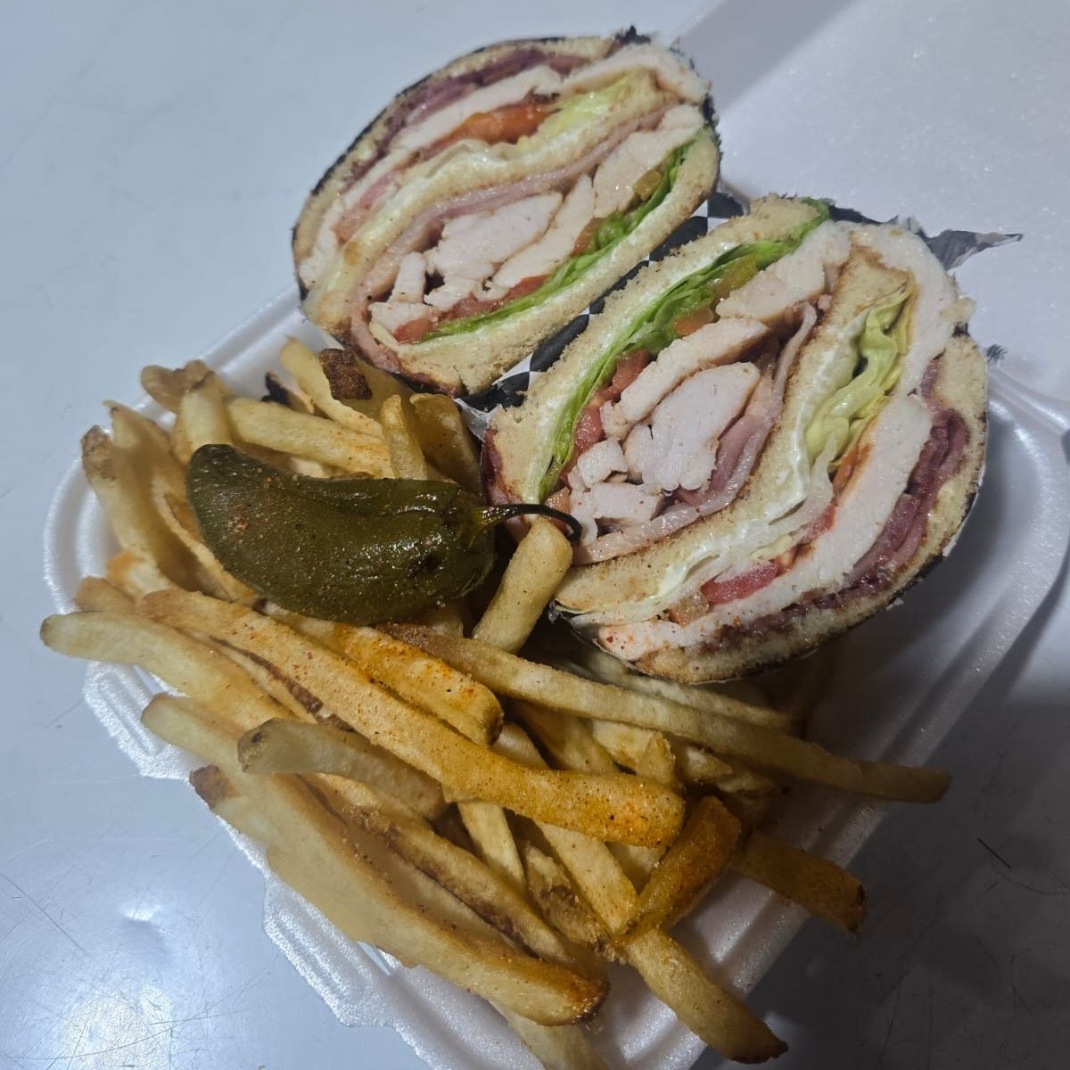 Pollo ala plancha o empanizado, tocino, mayonesa, letchuga, jitomate, aguacate, pepinillos y aderezo especial de la casa con papas