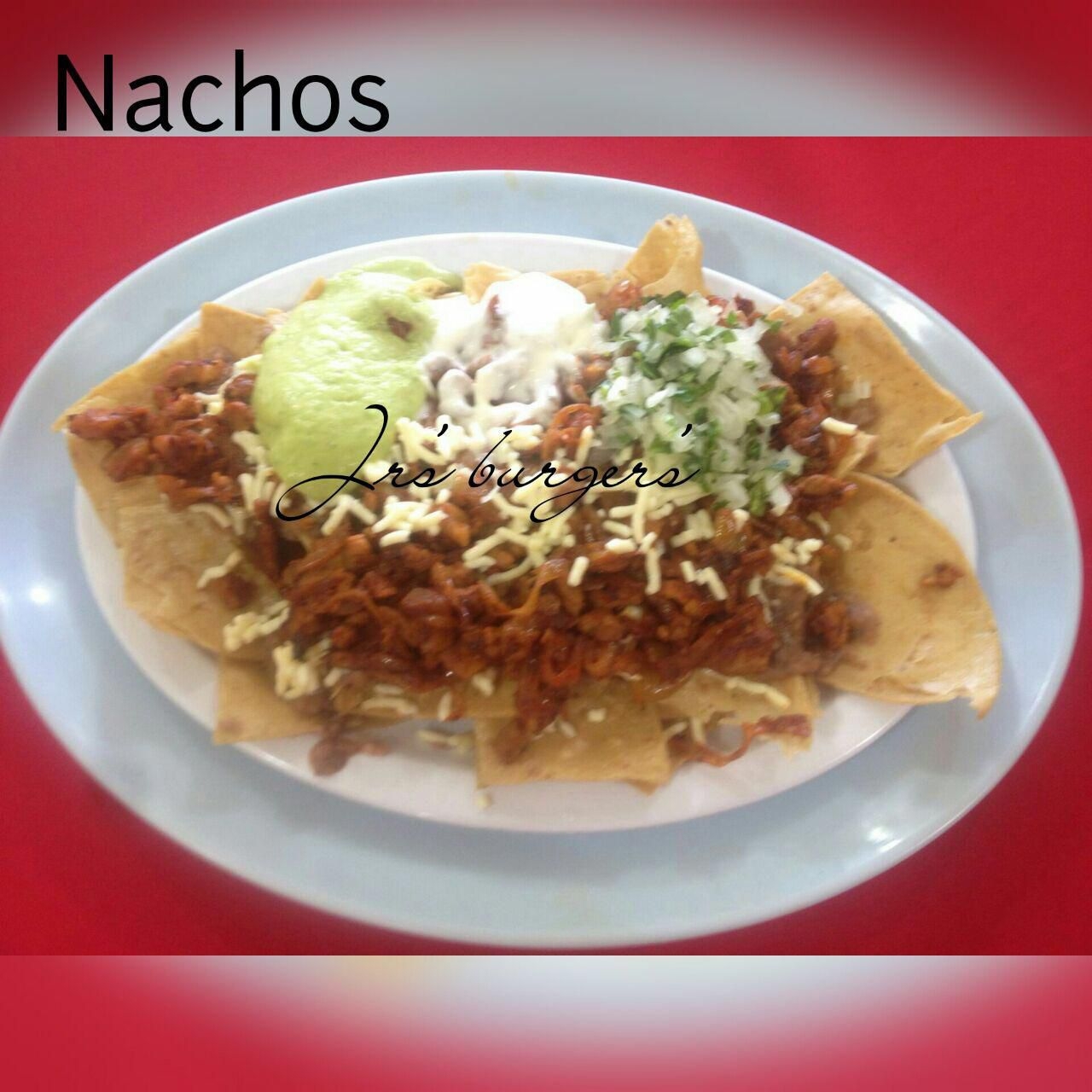 Totopos, frijol, carne queso asadero derretido, guacamole y crema