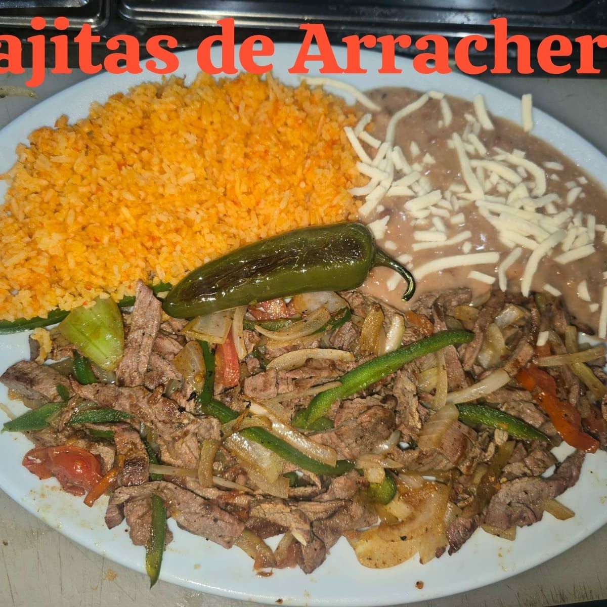 Arranchera asada acompañado de arroz, frijoles,cebolla azada con queso fundido ,chile toreado y 5 tortillas