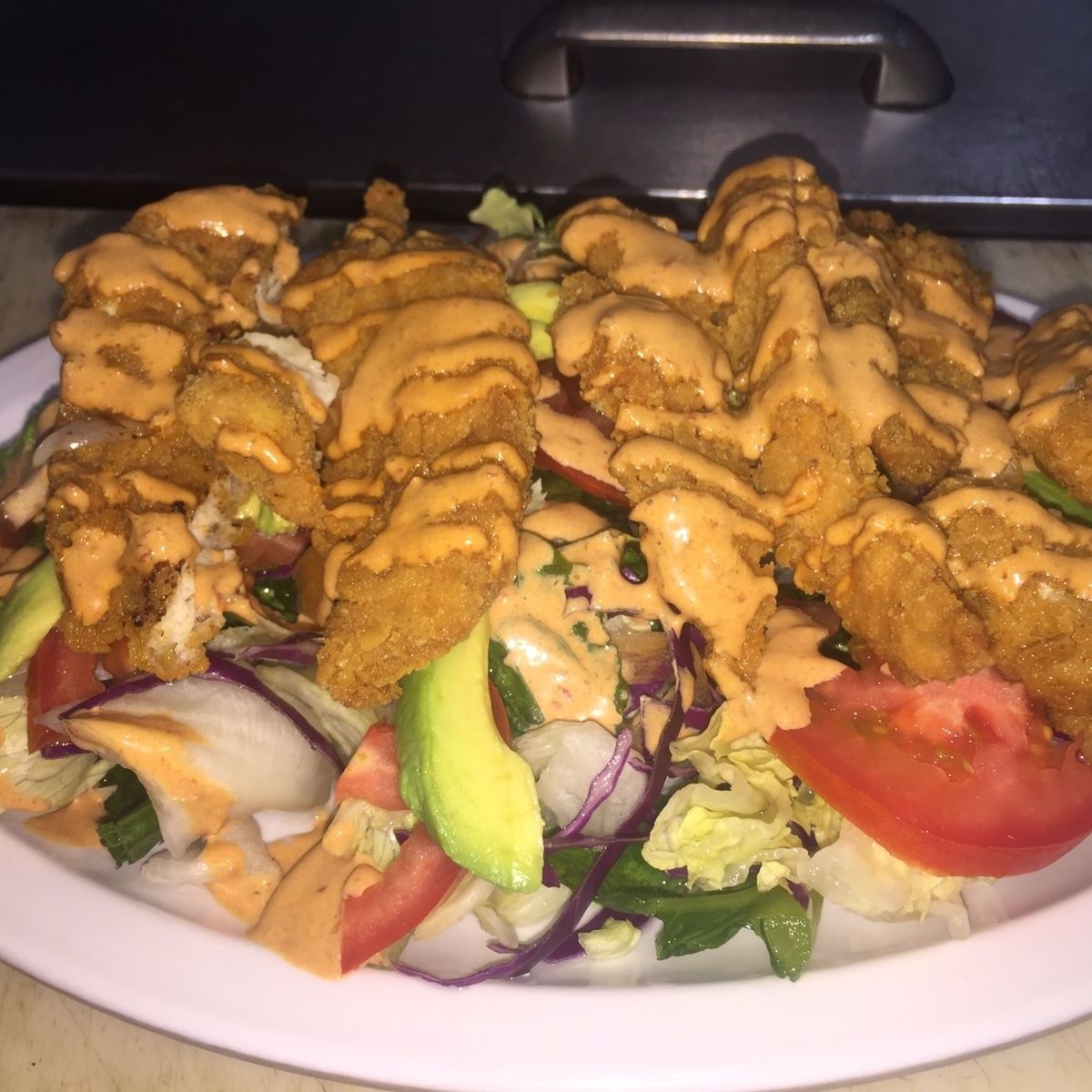 Tiritas de pechuga de pollo empanizadas bañada ya sea NATURALES,BBQ o BUFFALO y aderezo