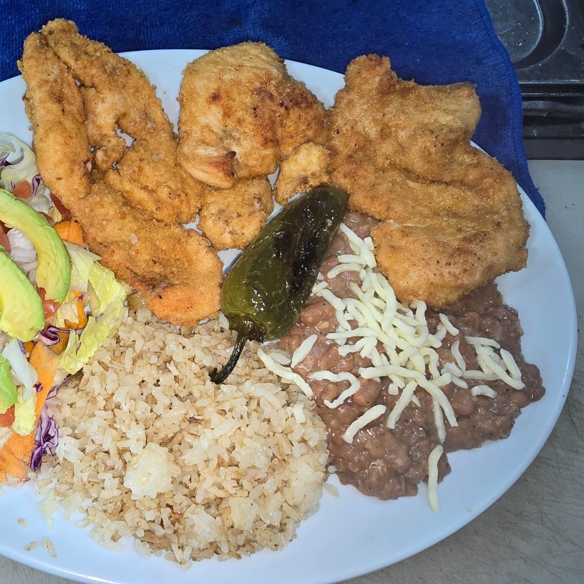 Pollo a la plancha o empanizado acompañado de arroz, frijoles, y 5 tortillas