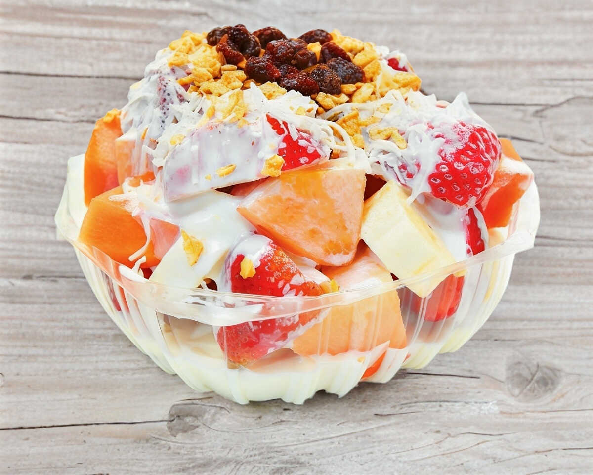 Mix de frutas bañado con crema especial o yogurt, miel, 2 cereales a elegir y un topping especial. Plato personal