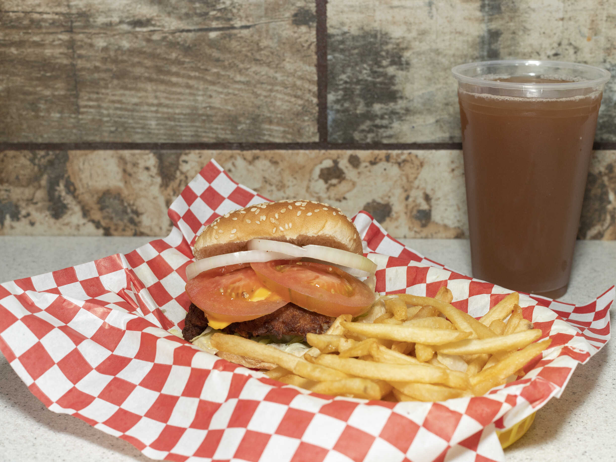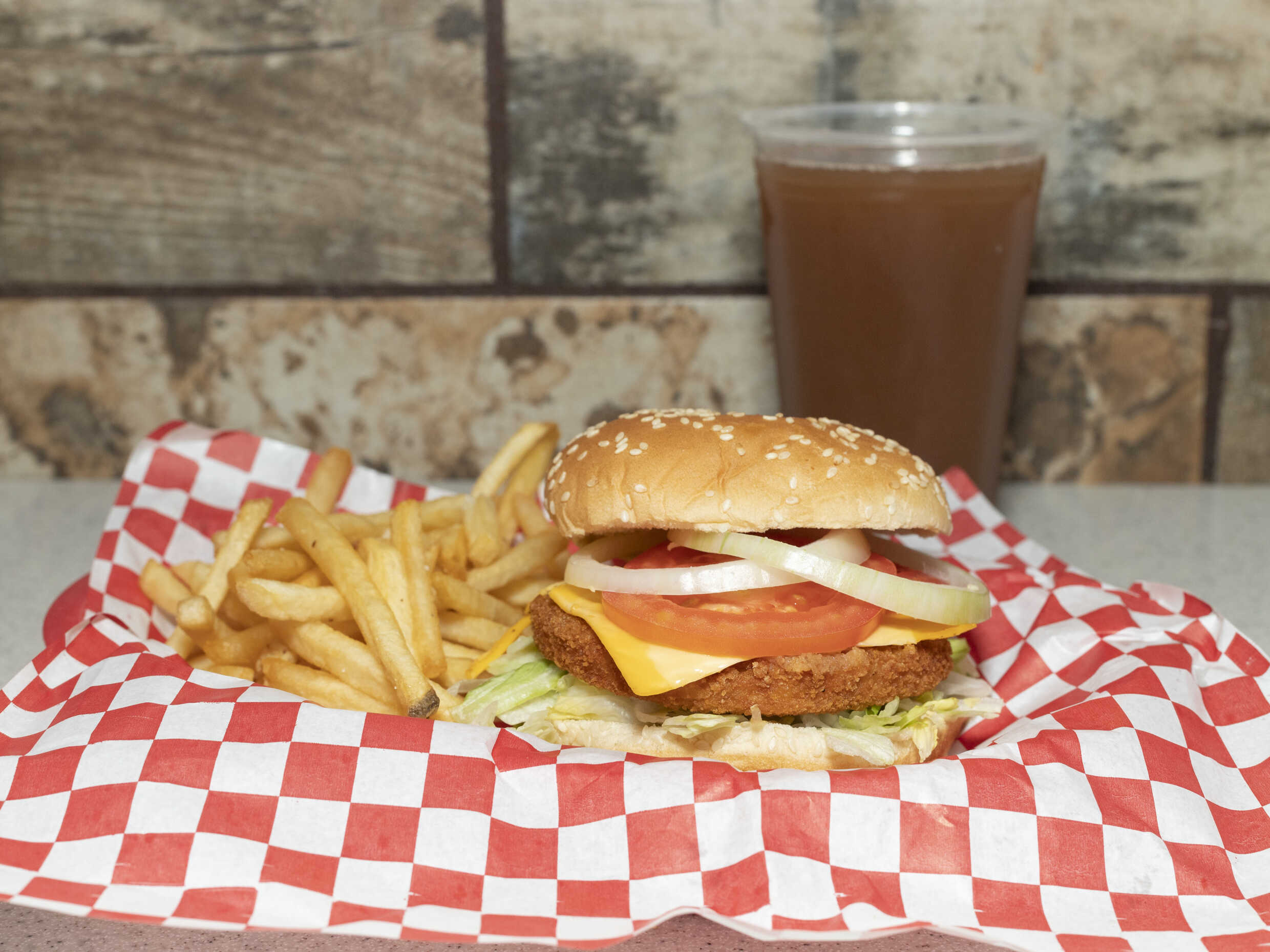 Hamburguesa con pollo, queso amarillo tipo Americano, lechuga, cebolla, jitomate y aderzo.