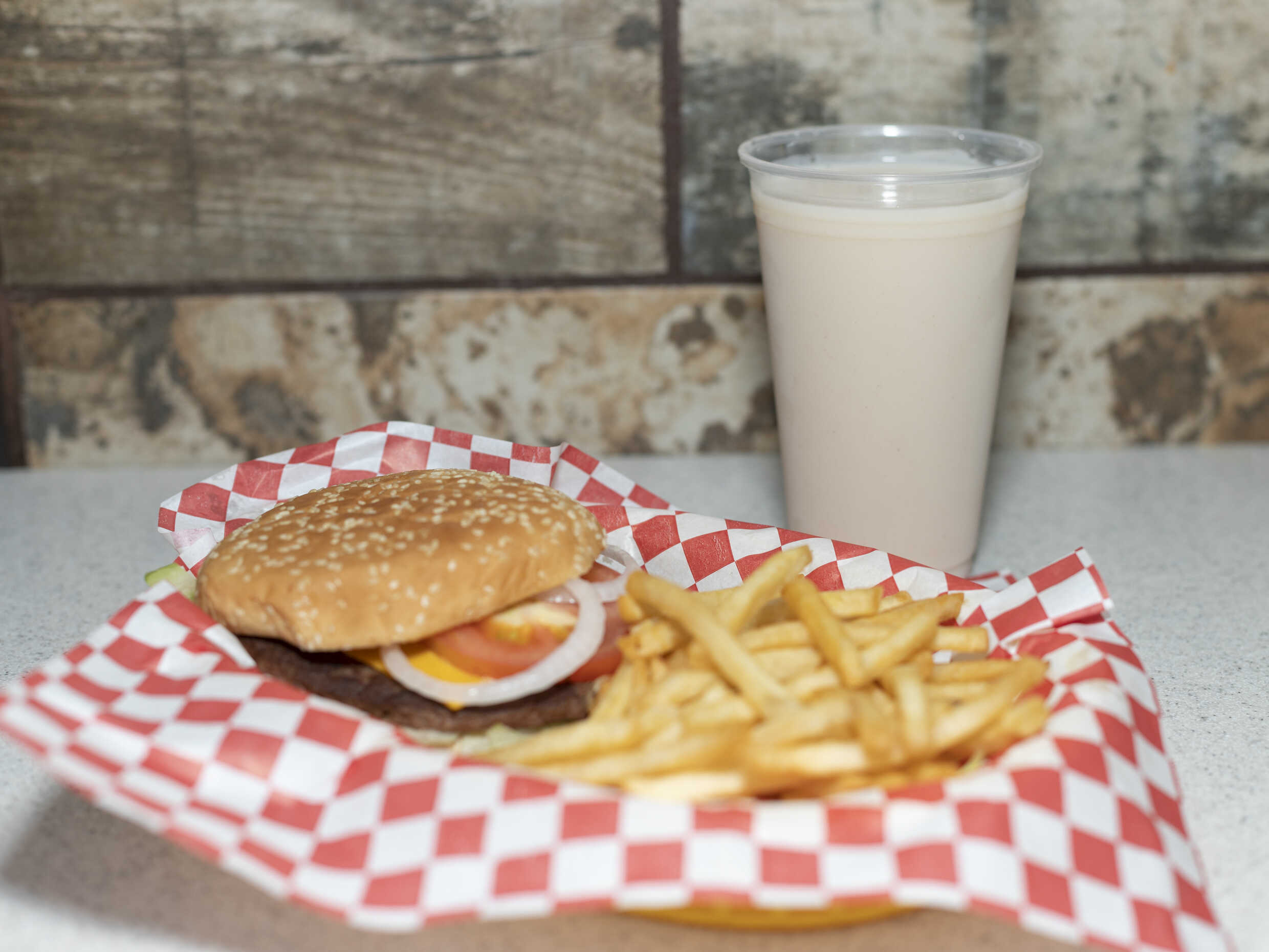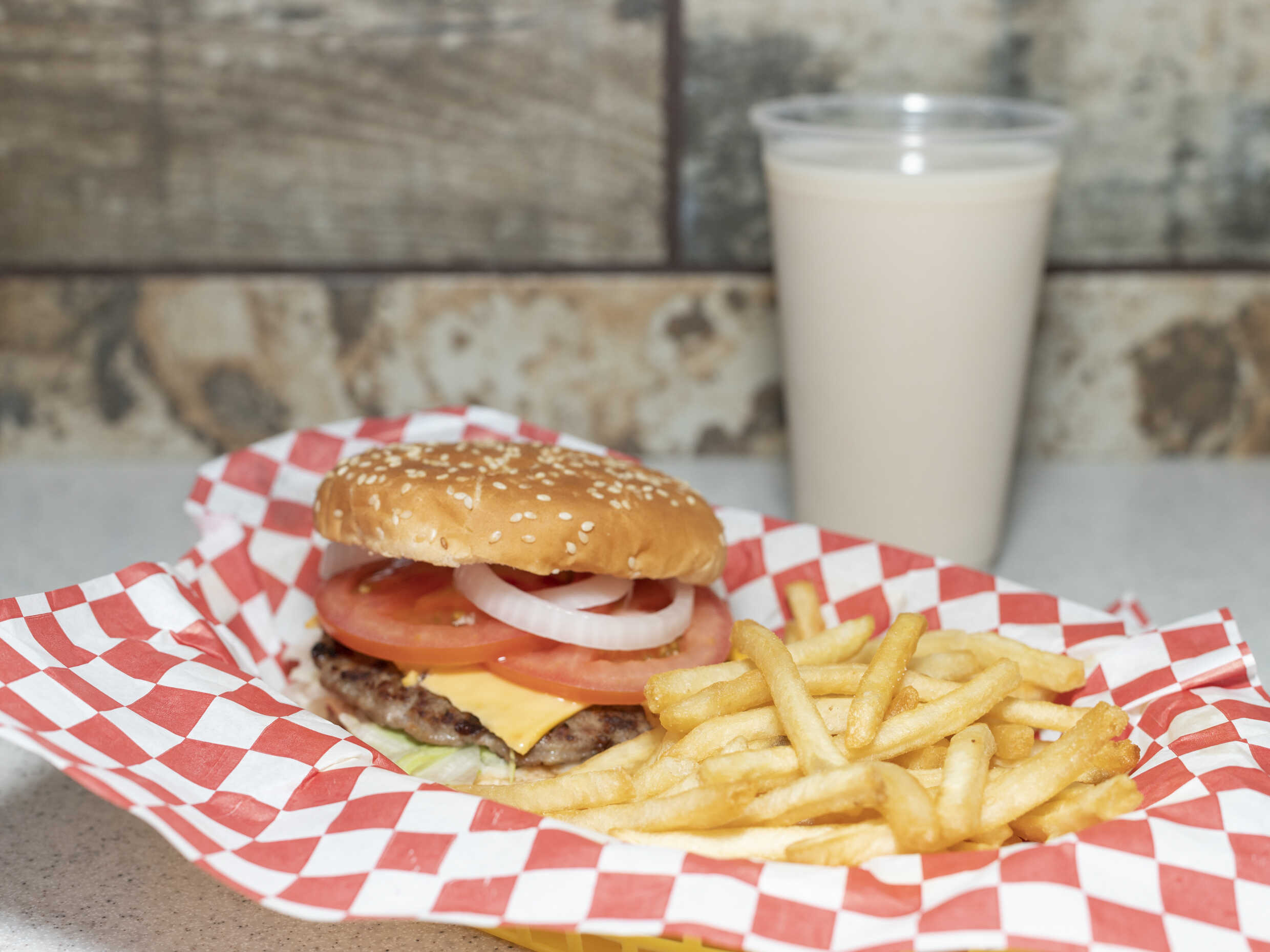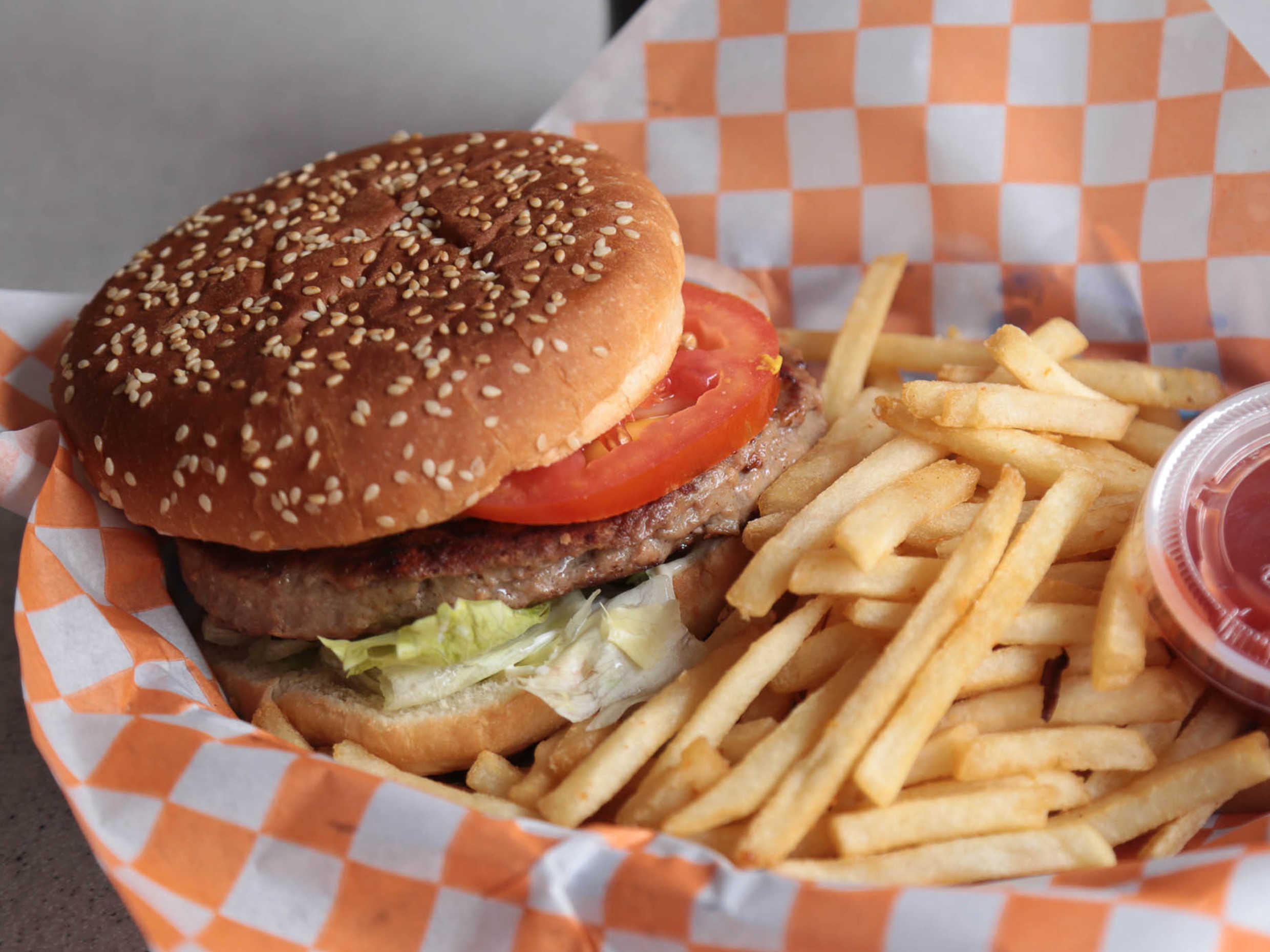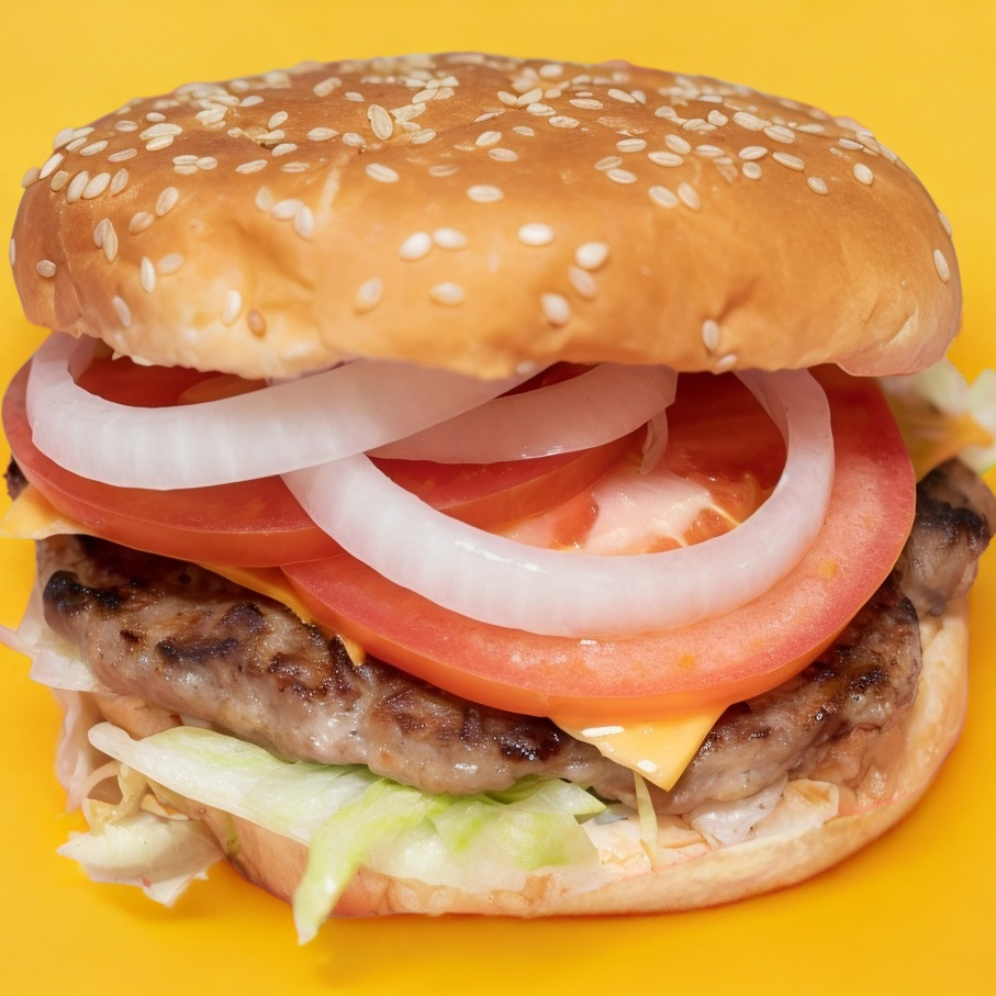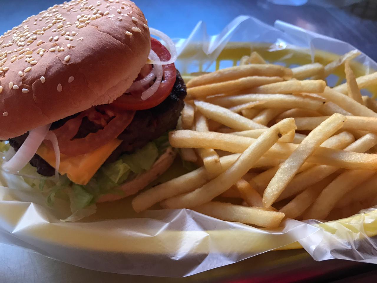 Hamburguesa con queso tipo americano, lechuga, jitomate.