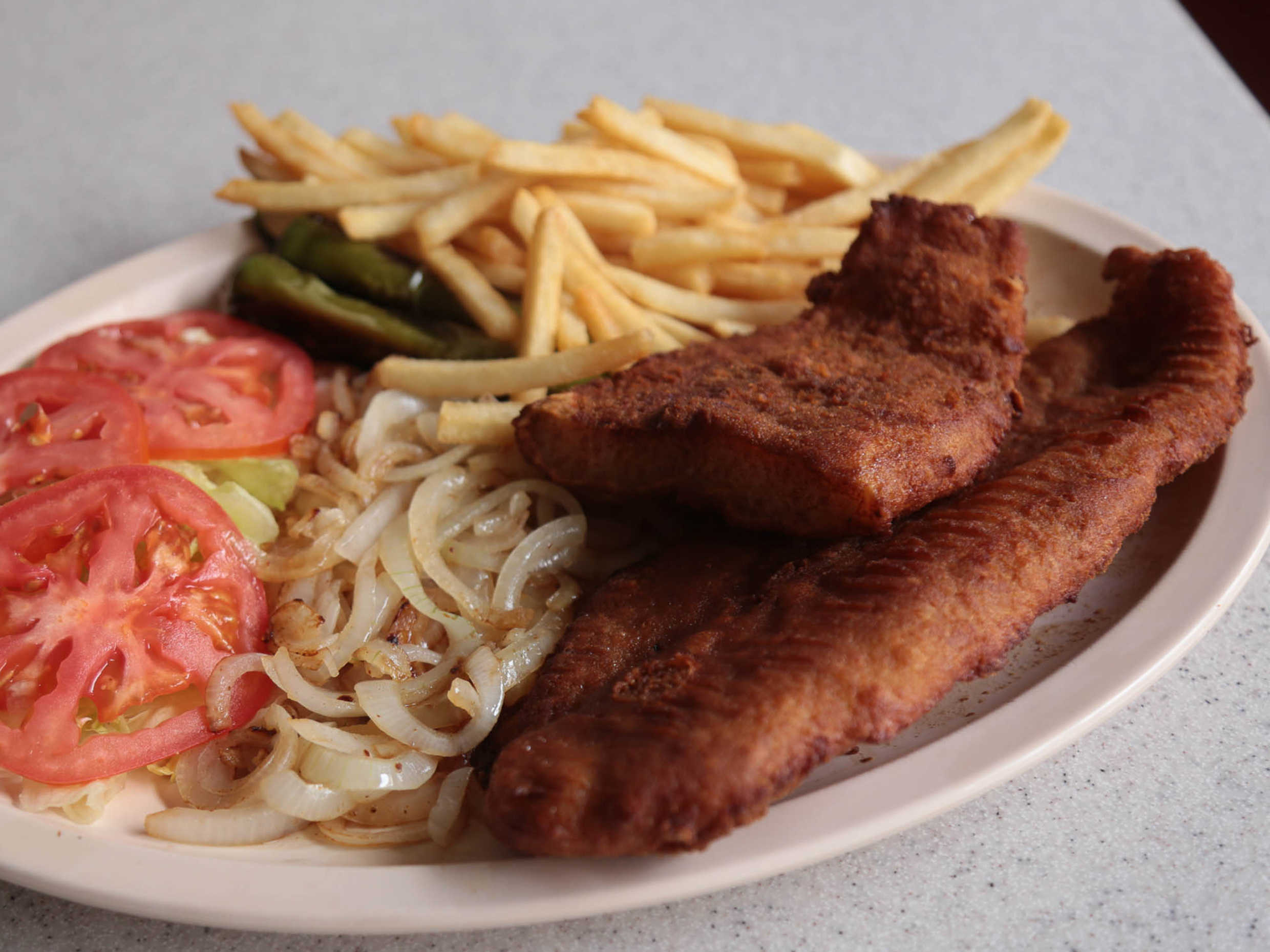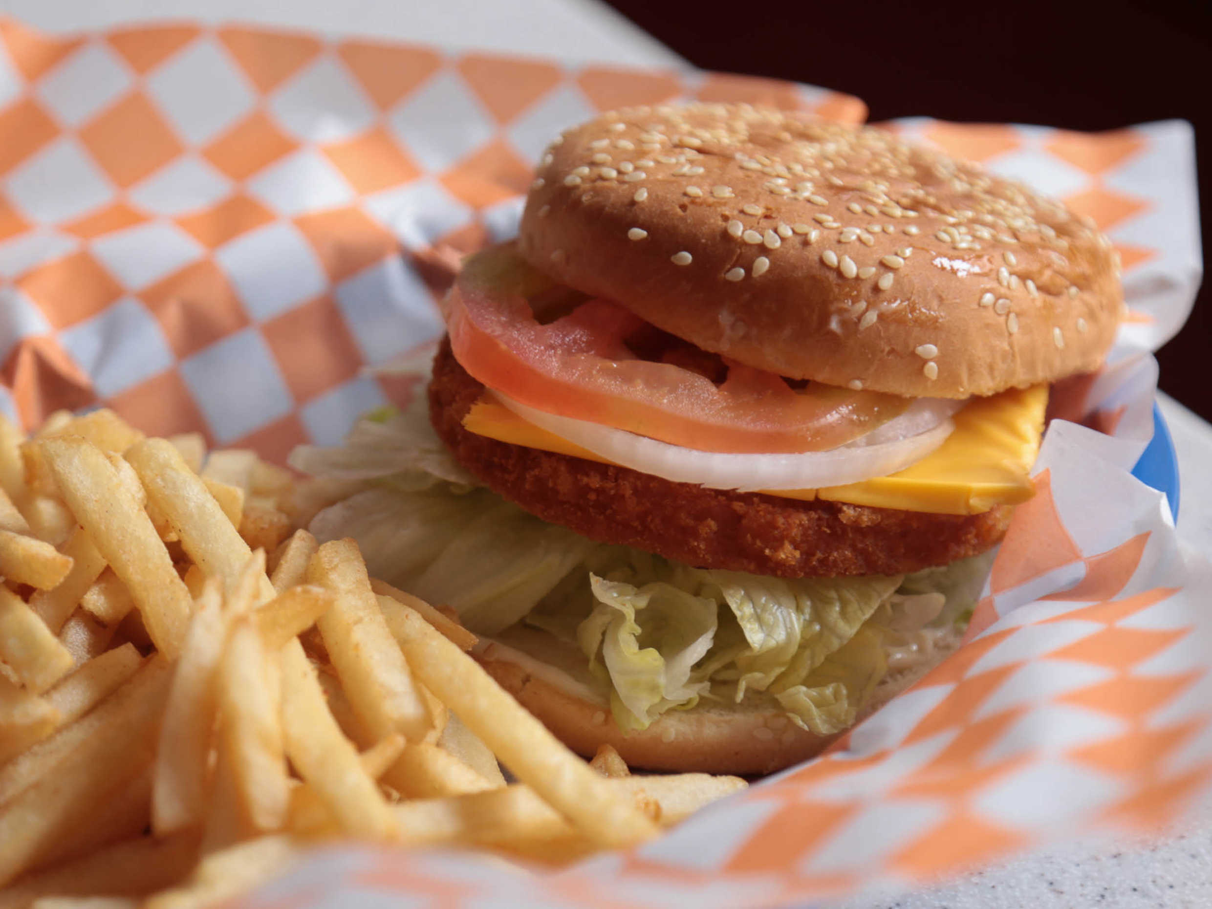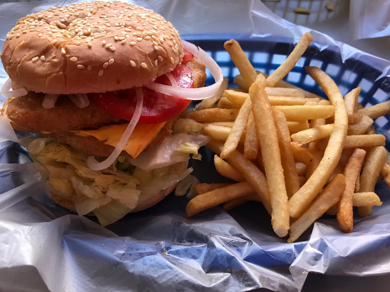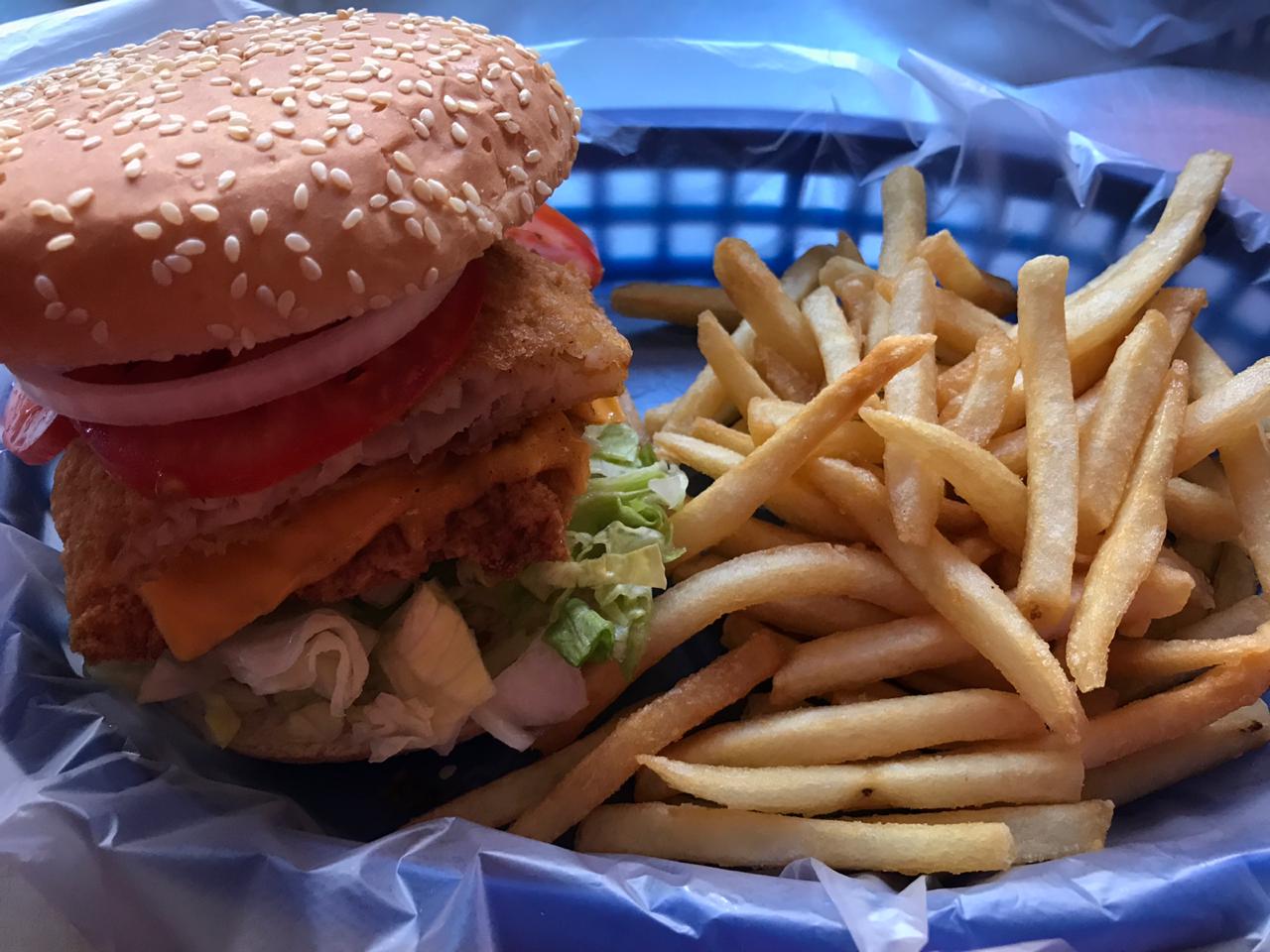 Hamburguesa con pescado doble, queso y papas.