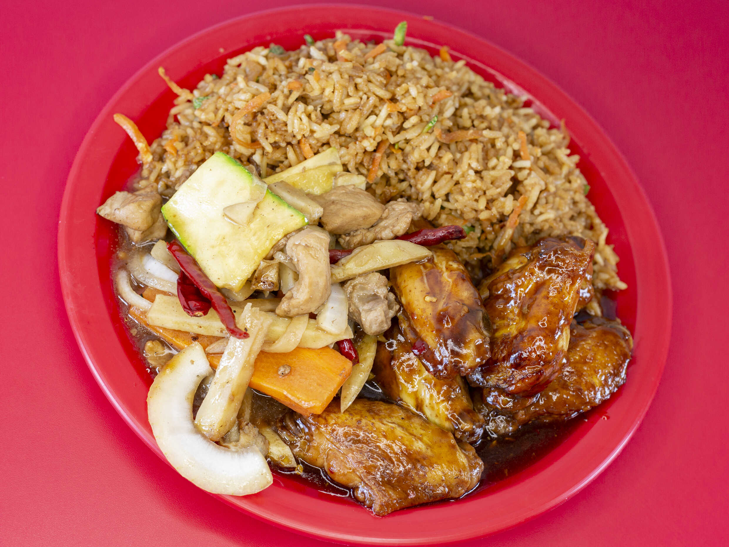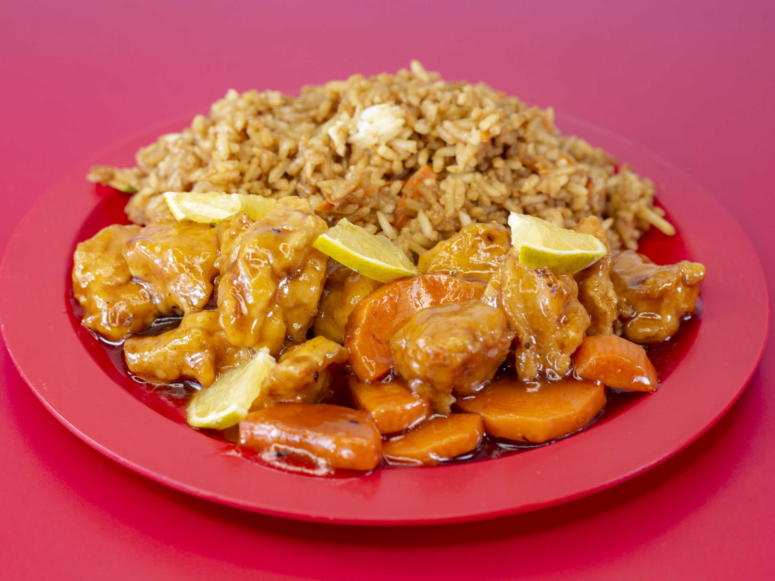 Arroz chino con vegetales, pollo capeado, acompañado de pepino, Tampico, queso Philadelphia, salsa de anguila y ajonjolí.