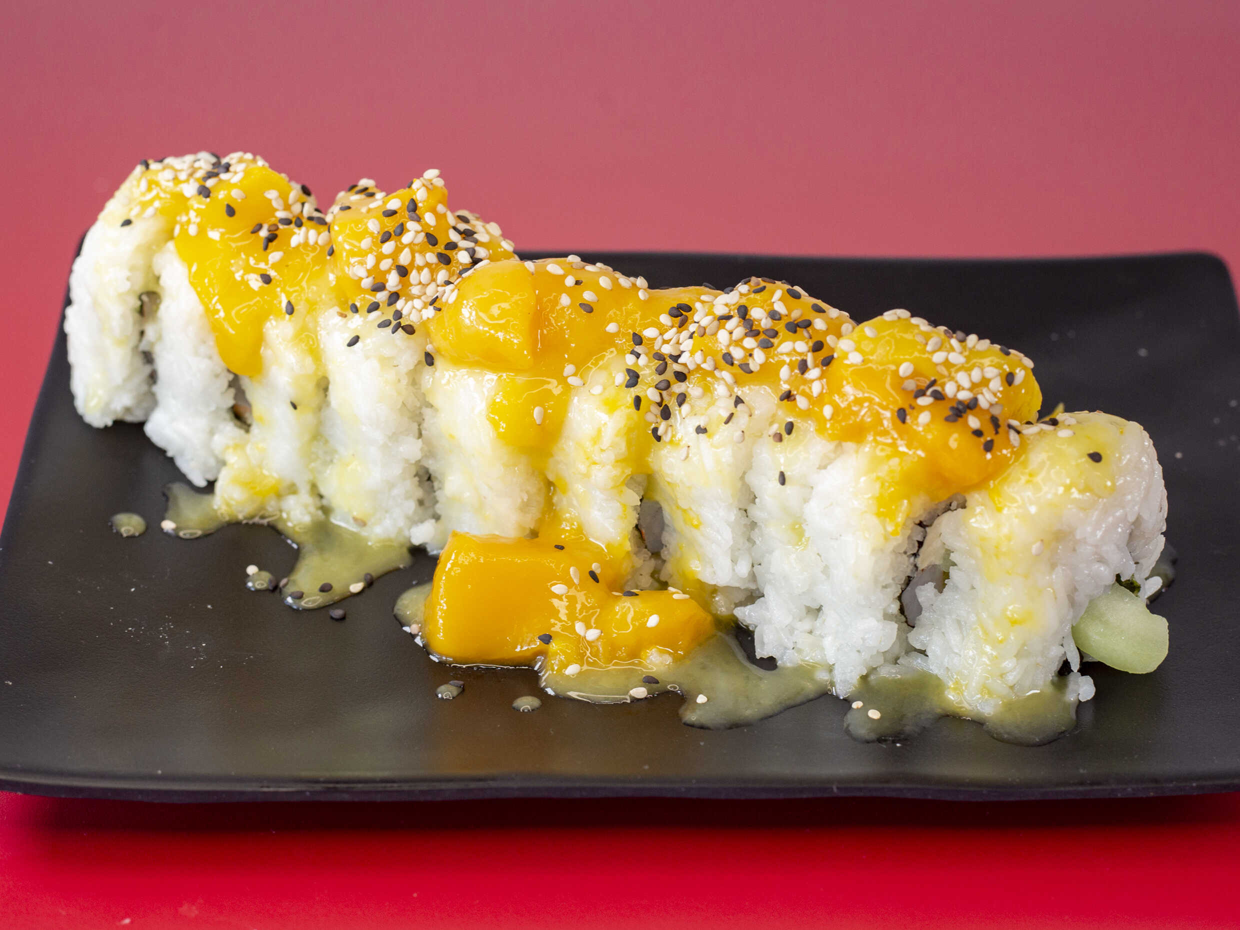 Rolo natural relleno de camarón queso philadelphia y pepino. Por fuera trocitos de mango, salsa de mango, ajonjolí y anguila.