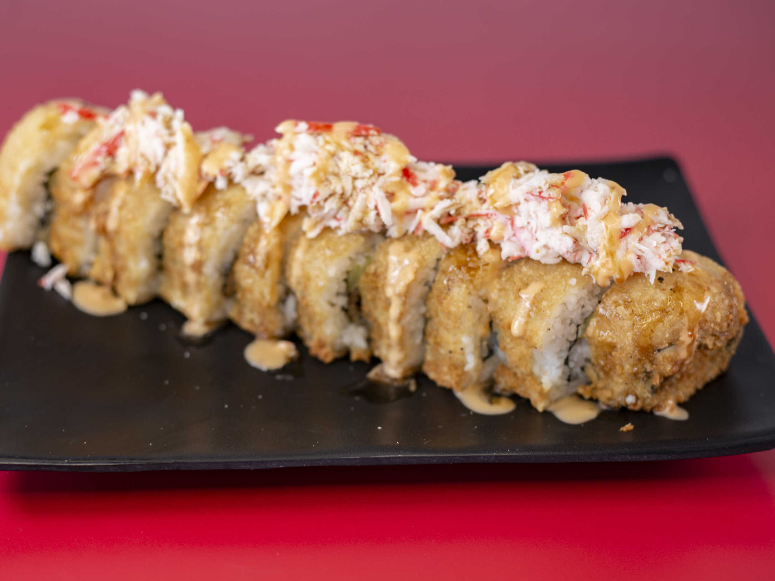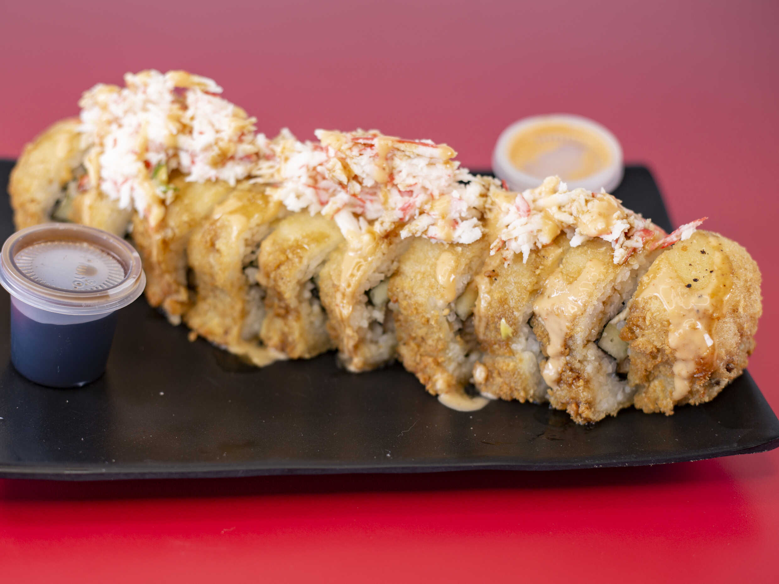 Rollo empanizado relleno de pepino, philadelphia, carne y camarón. Acompañado de salsa tampico y aderezado con salsa chipotle y anguila.
