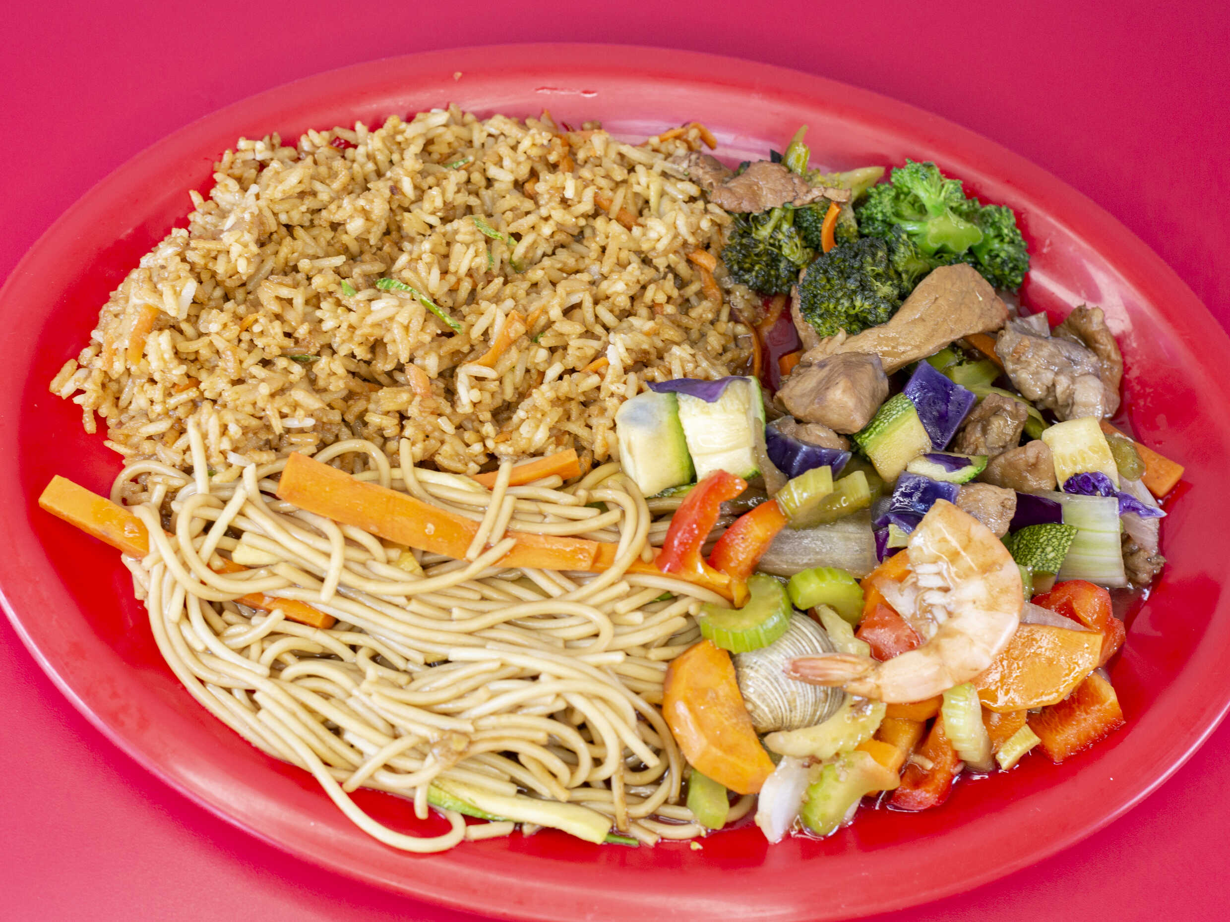 arroz+spaguetti+cerdo cantonés con brócoli+ 1 rollito primavera + 1/2 sushi hot roll empanizado