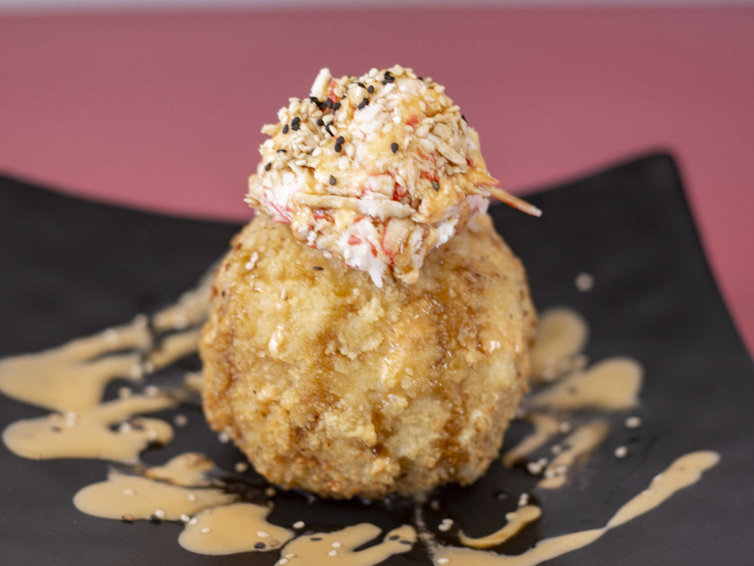 Bola de arroz empanizada. Rellena de camarones con salsa chipotle y philadelphia. Adornada con aderezo chipotle. Ajonjolí y salsa de anguila.