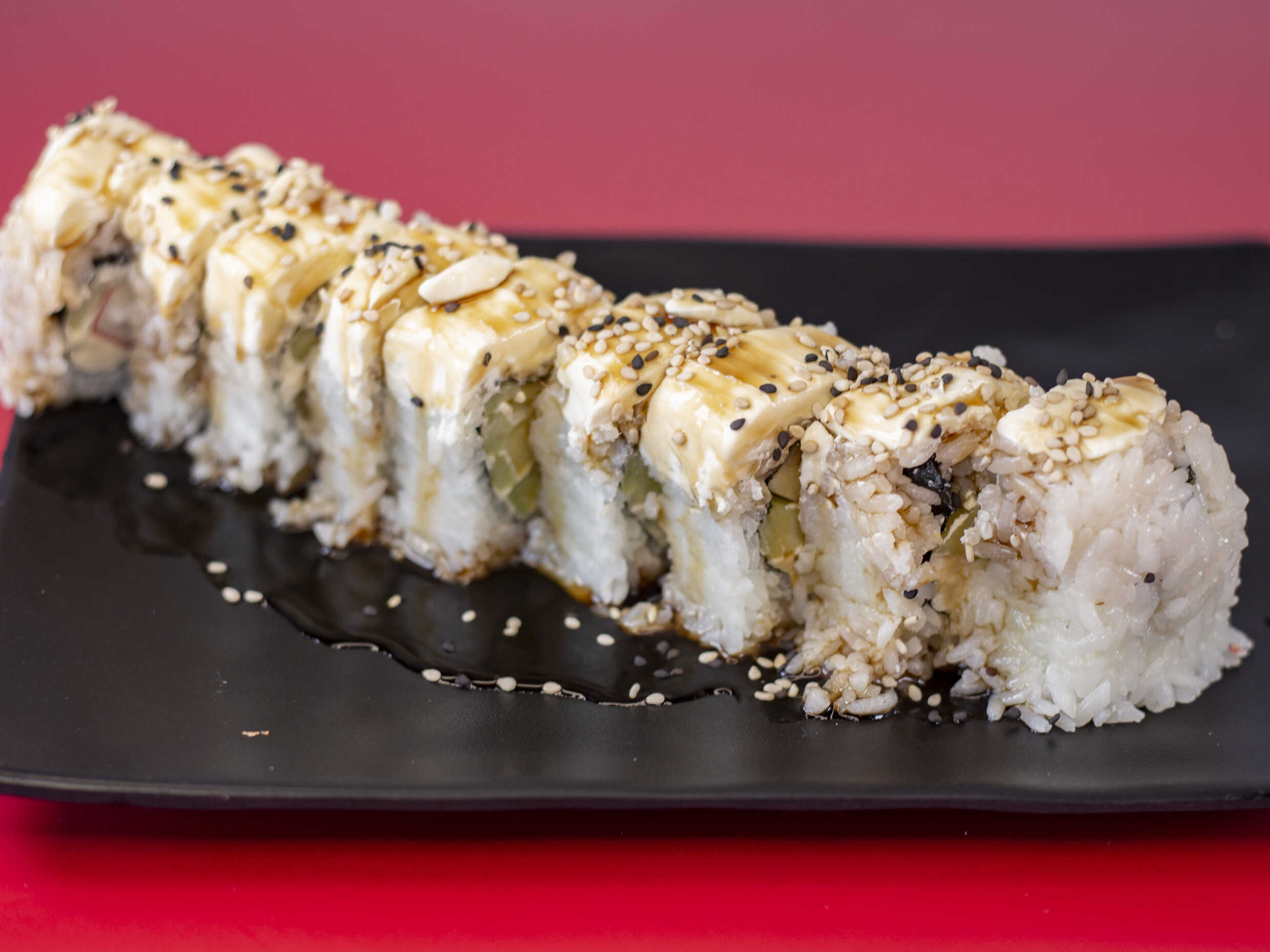 Arroz blanco de sushi, acompañado de tampico, aguacate, pepino, queso Philadelphia, ajonjolí y salsa de anguila.