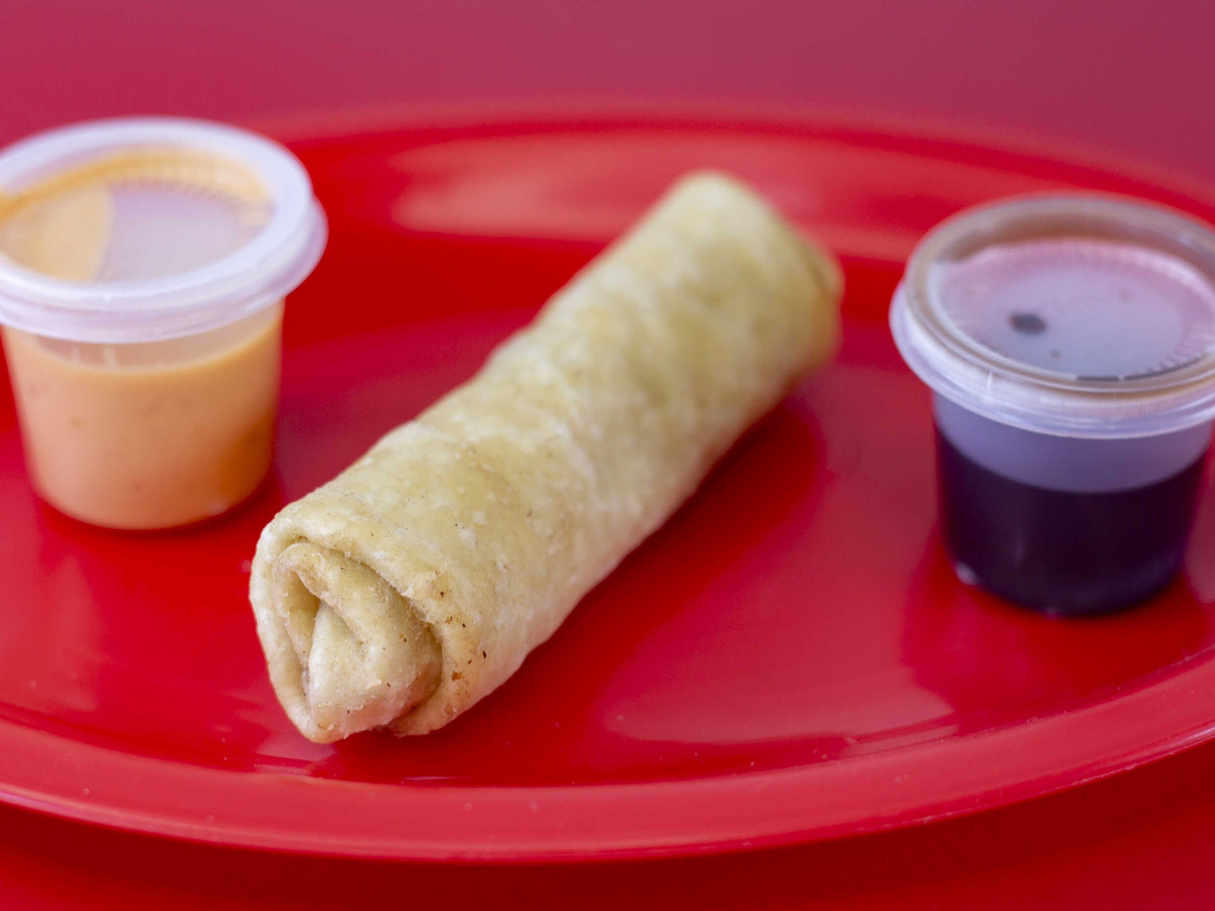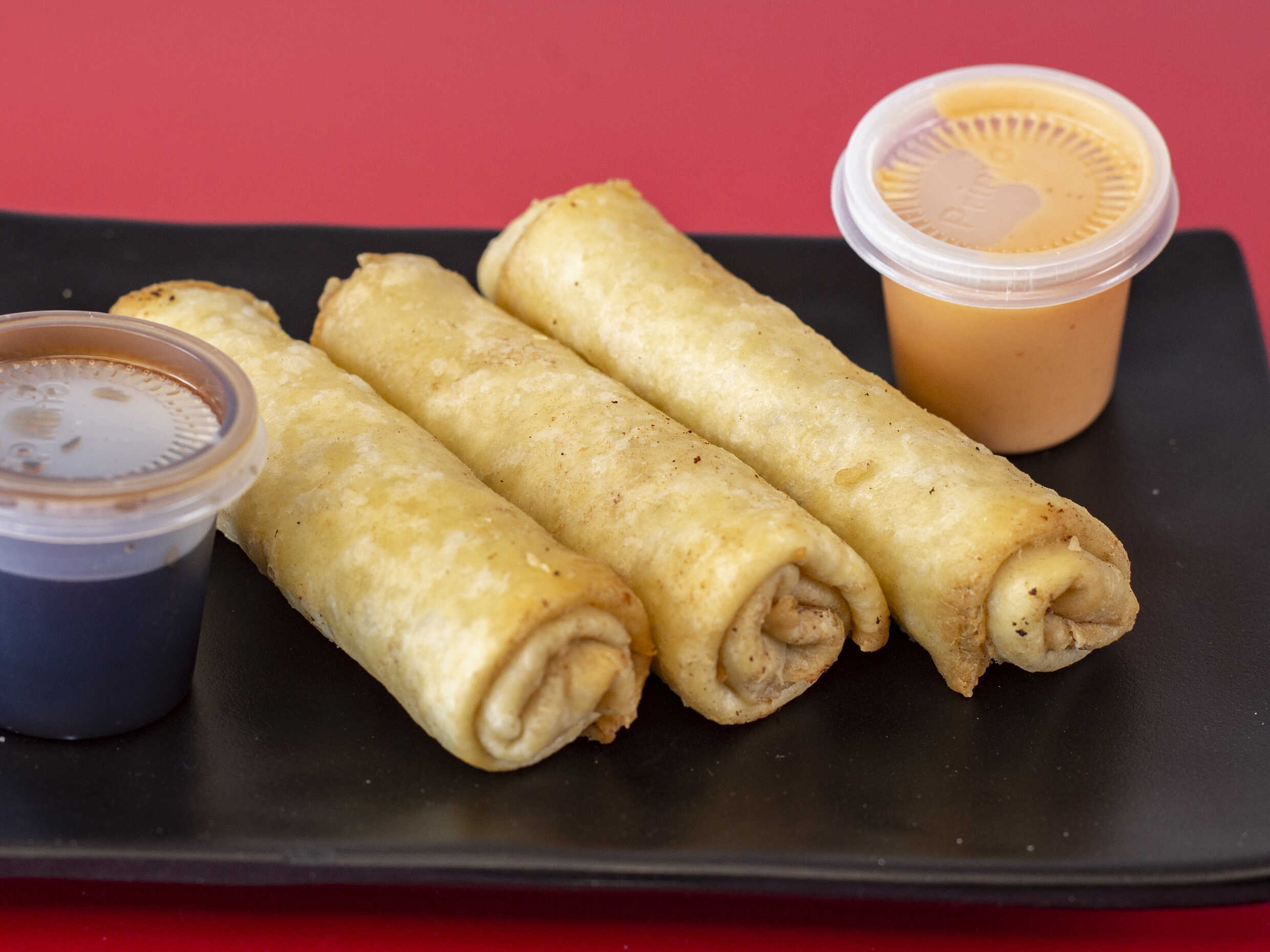 Rollo empanzado relleno de pepino, philadelphia, carne y tocino. Acompañado de salsa tampico, salsa de anguila y aderezo de chipotle
