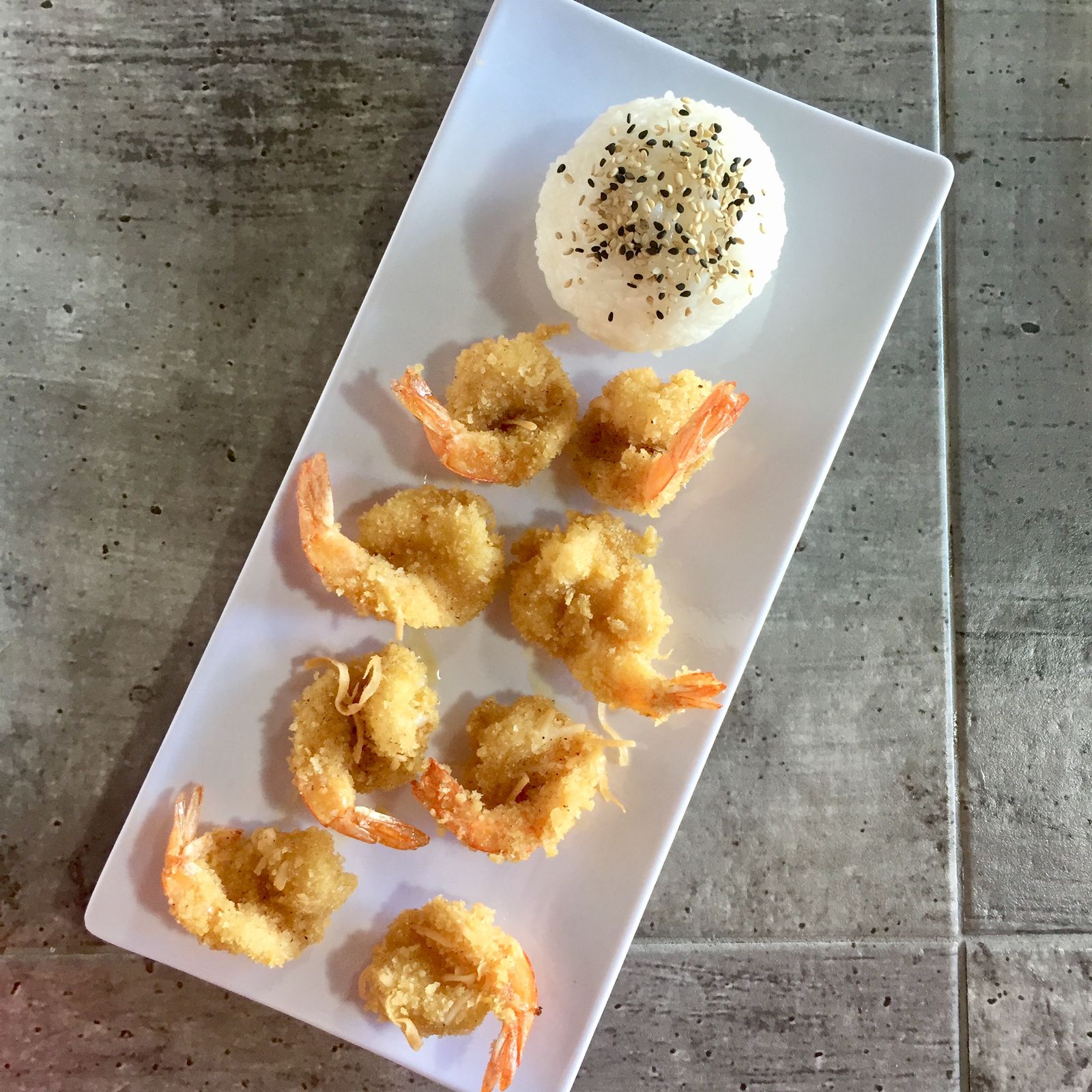 8 Camarones empanizados con panko y Tempura, acompañados de ensalada de col y zanahoria.