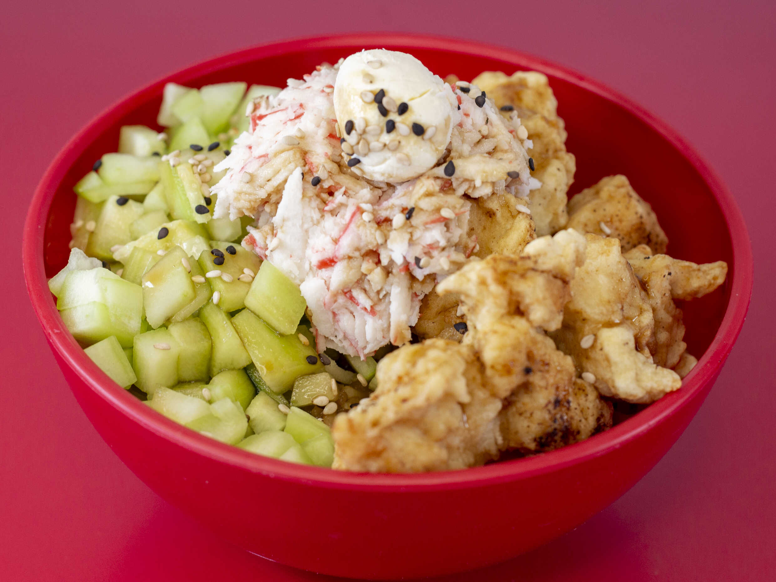 4 Bolitas de arroz empanizadas sobre ensalada de cangrejo y pepino acompañadas de Tampico y salsa de anguila.