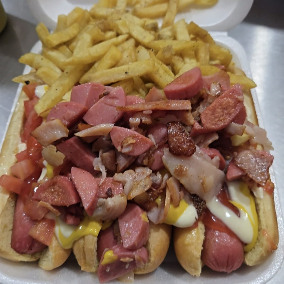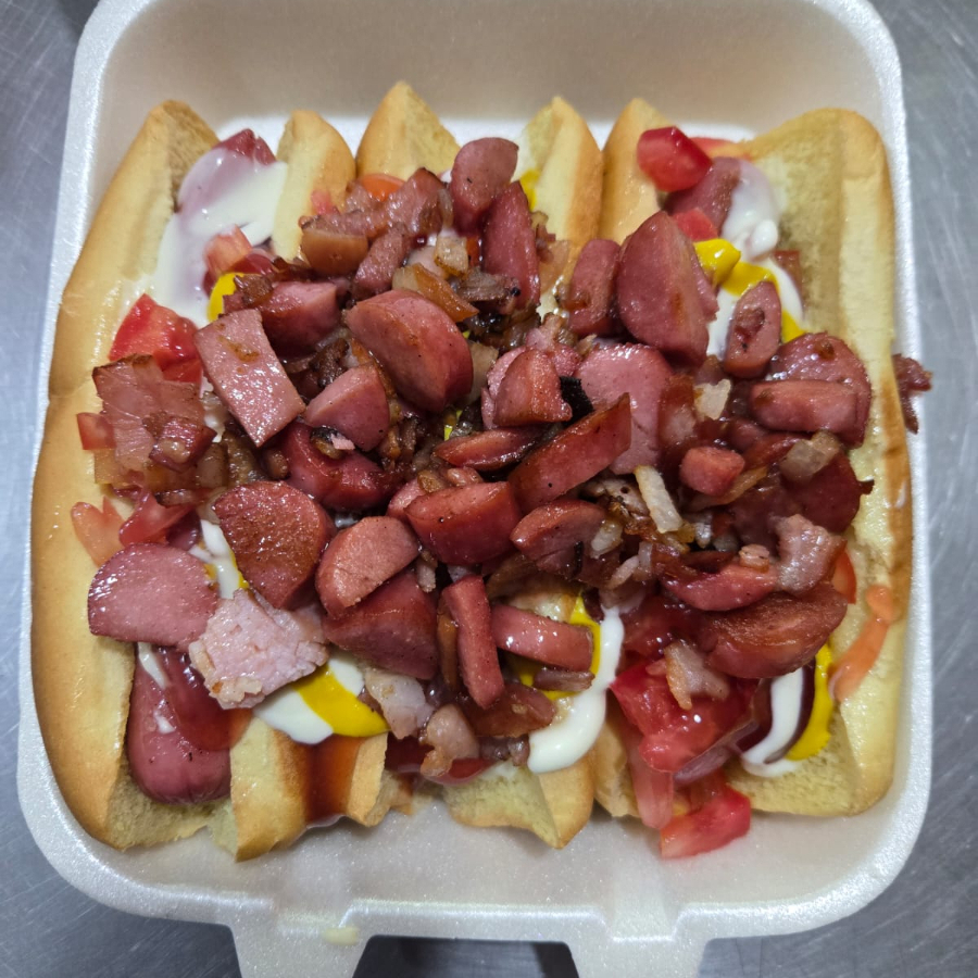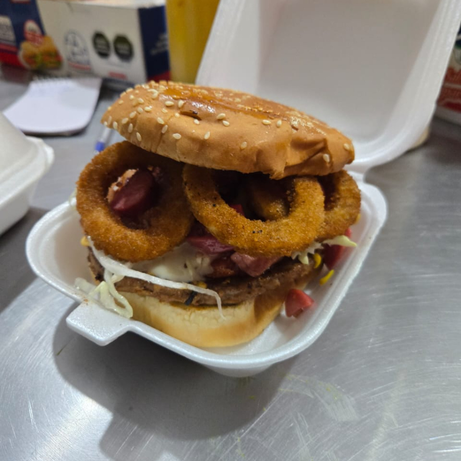 Aros de cebolla empanizados, mayonesa, queso americano, jamón, cátsup, crema, mostaza, lechuga, jitomate tocino y salchicha