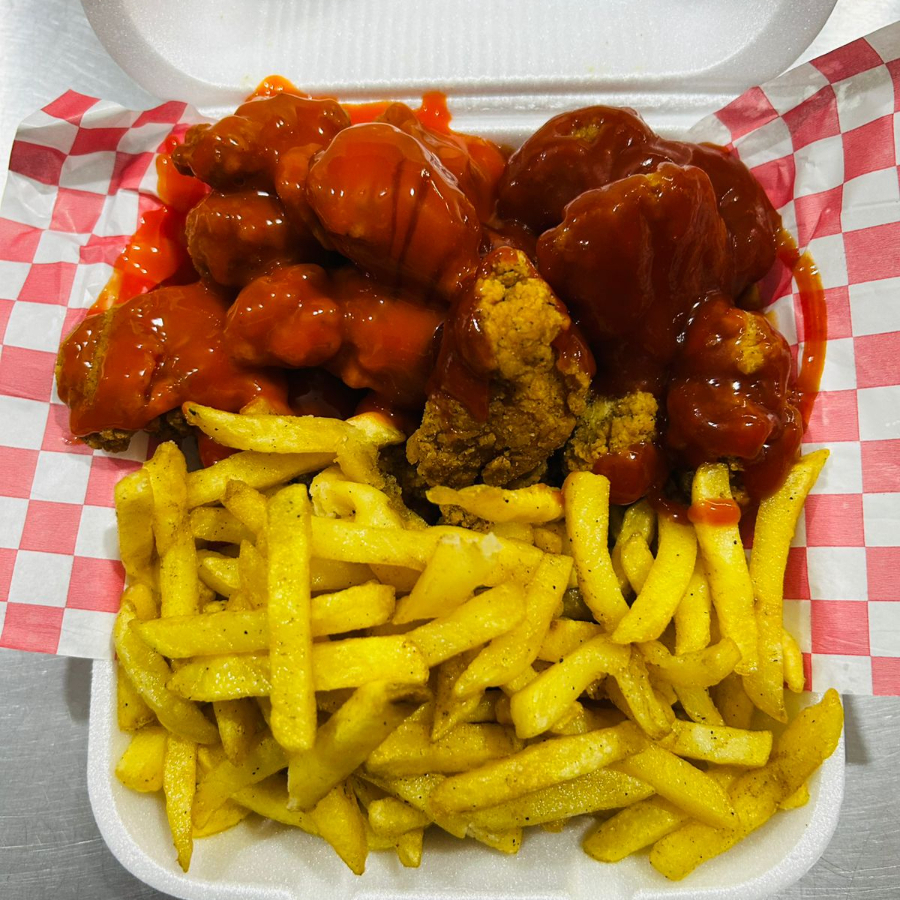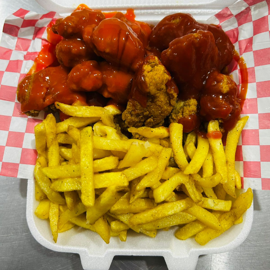 7 alitas con papas bañadas de la salsa de tu preferencia