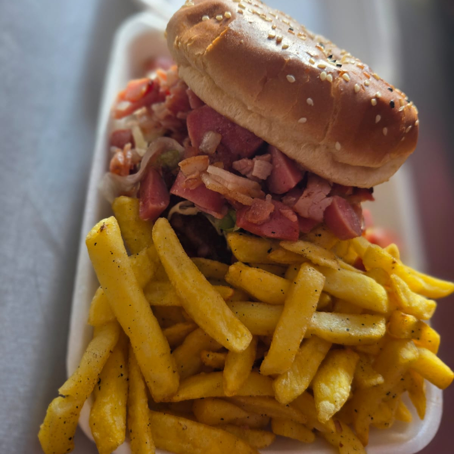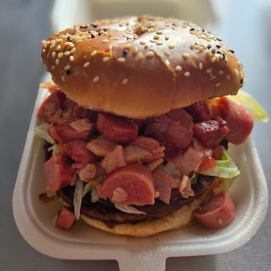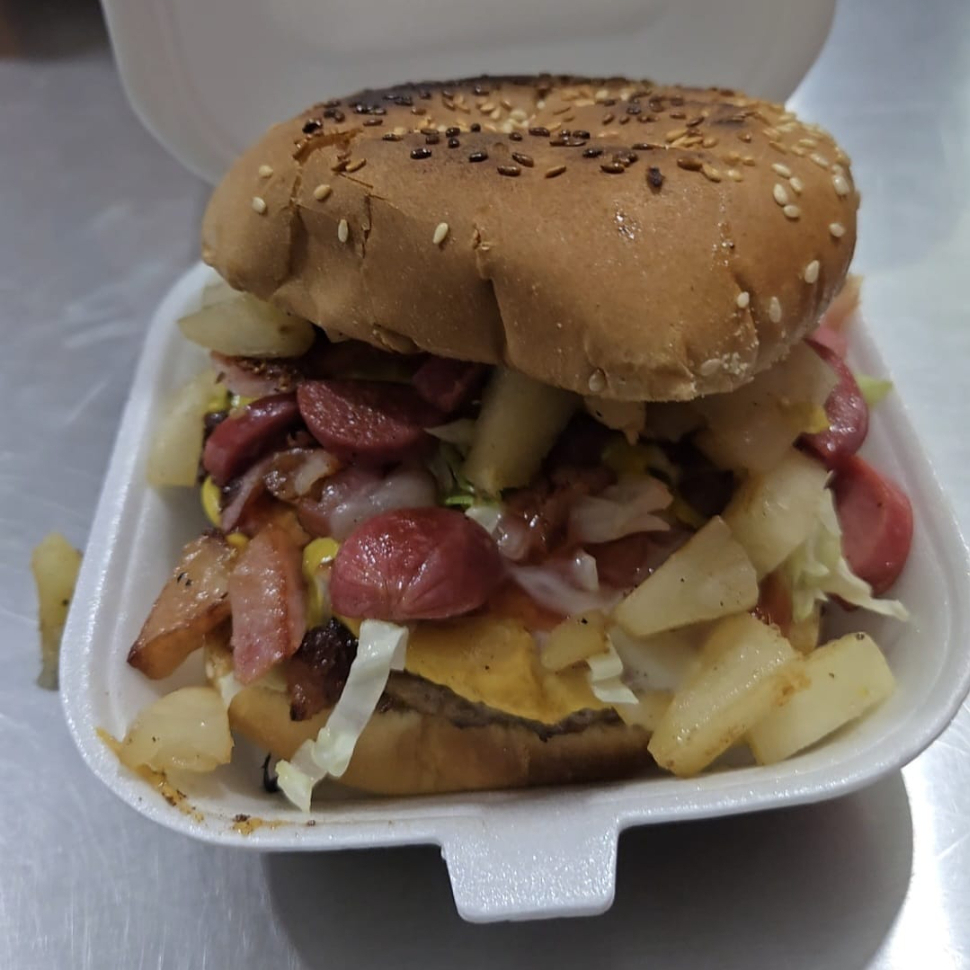 2 carnes, mayonesa, queso americano, jamón, lechuga, jitomate, cátsup, crema, mostaza, tocino y salchicha