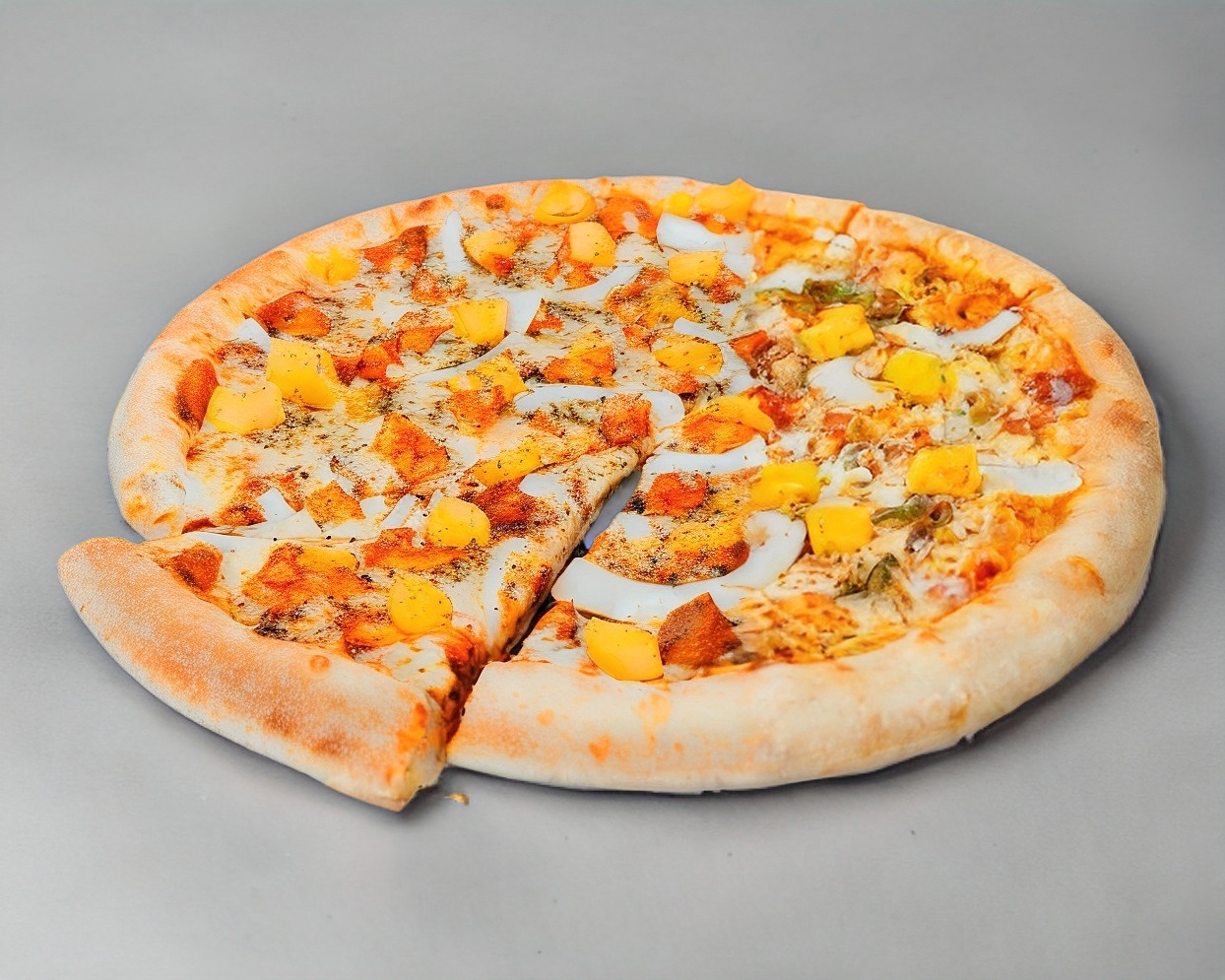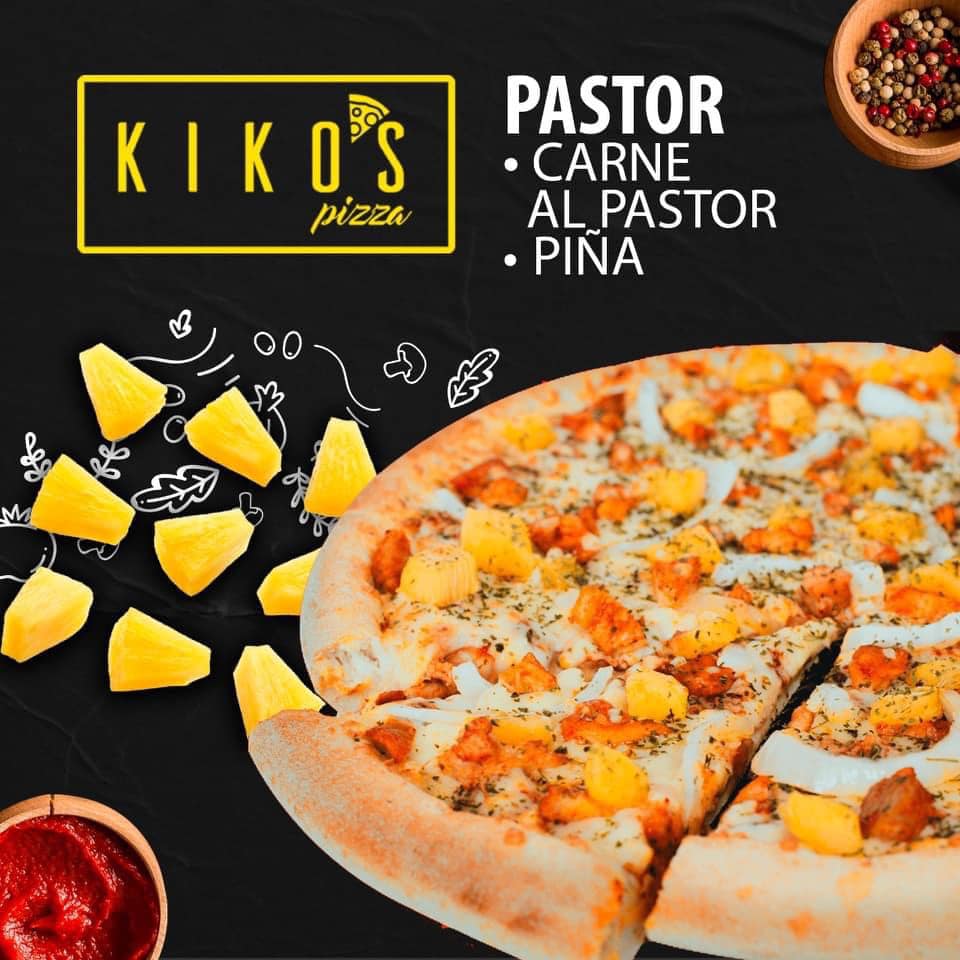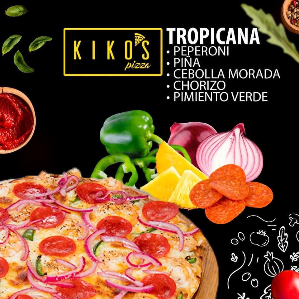 Peperoni, piña, cebolla morada, pimiento verde y chorizo.