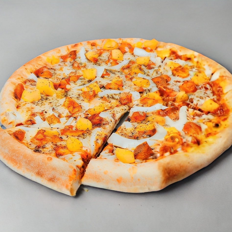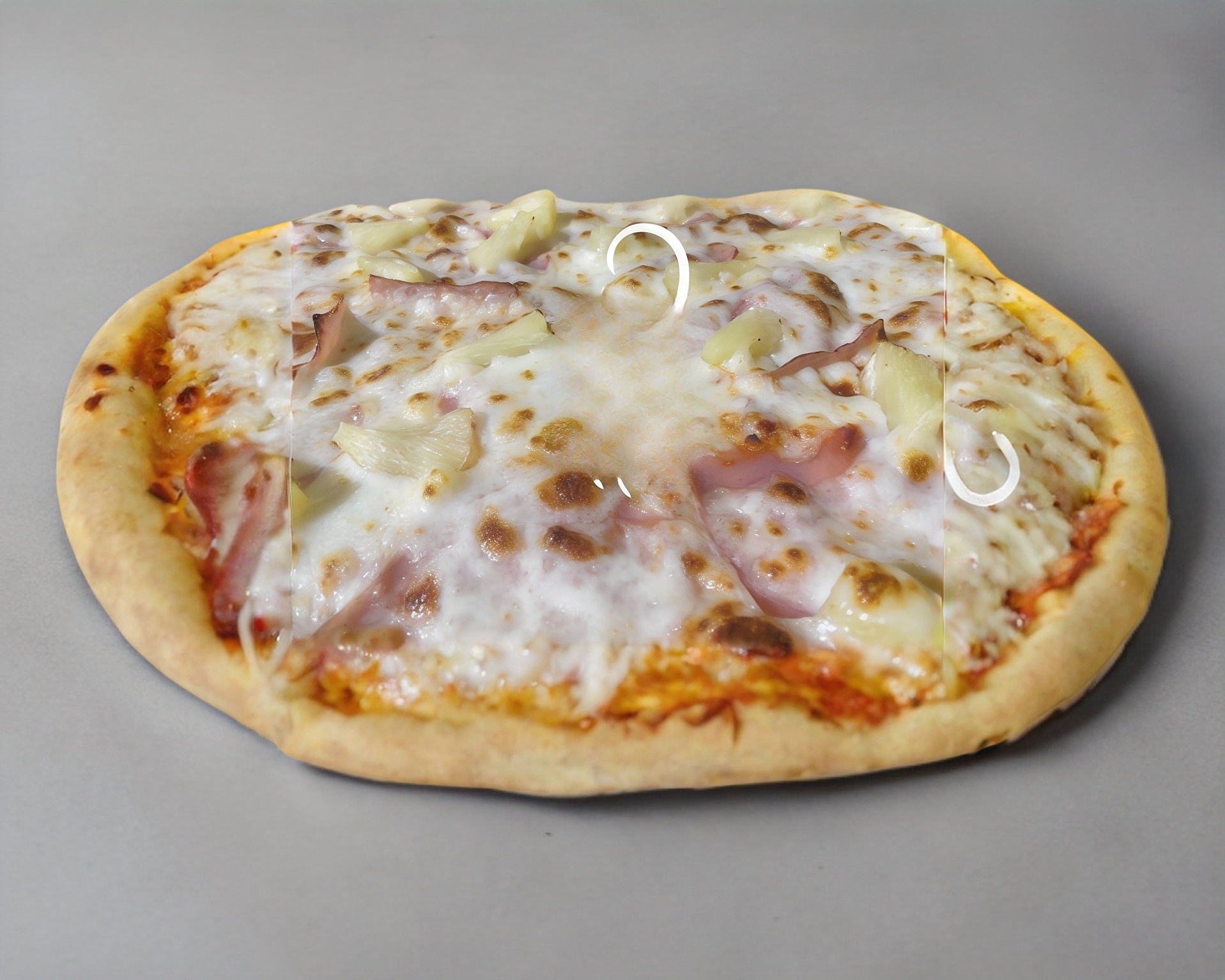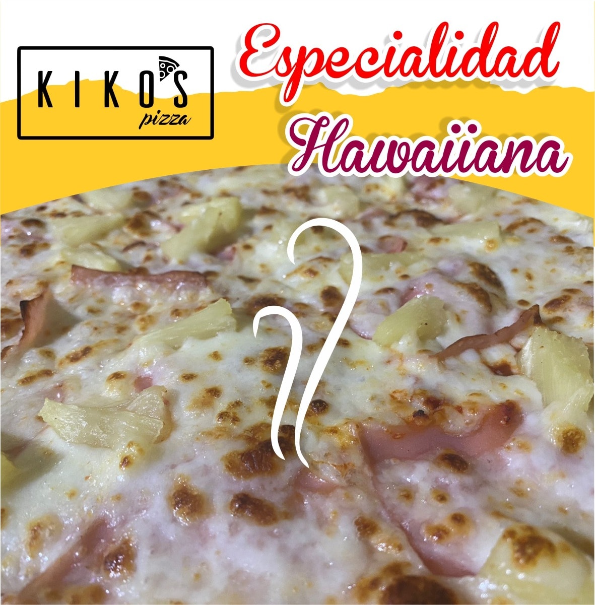 Peperoni, piña, cebolla morada, pimiento verde y chorizo.