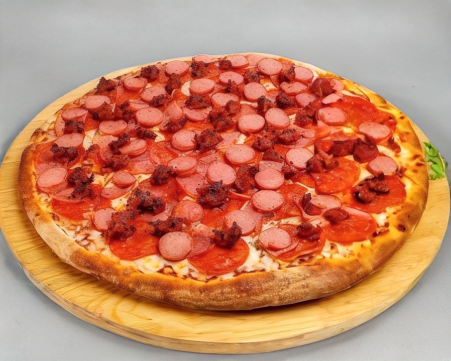 Pepperoni, champiñón, piña, pimiento verde y chorizo.