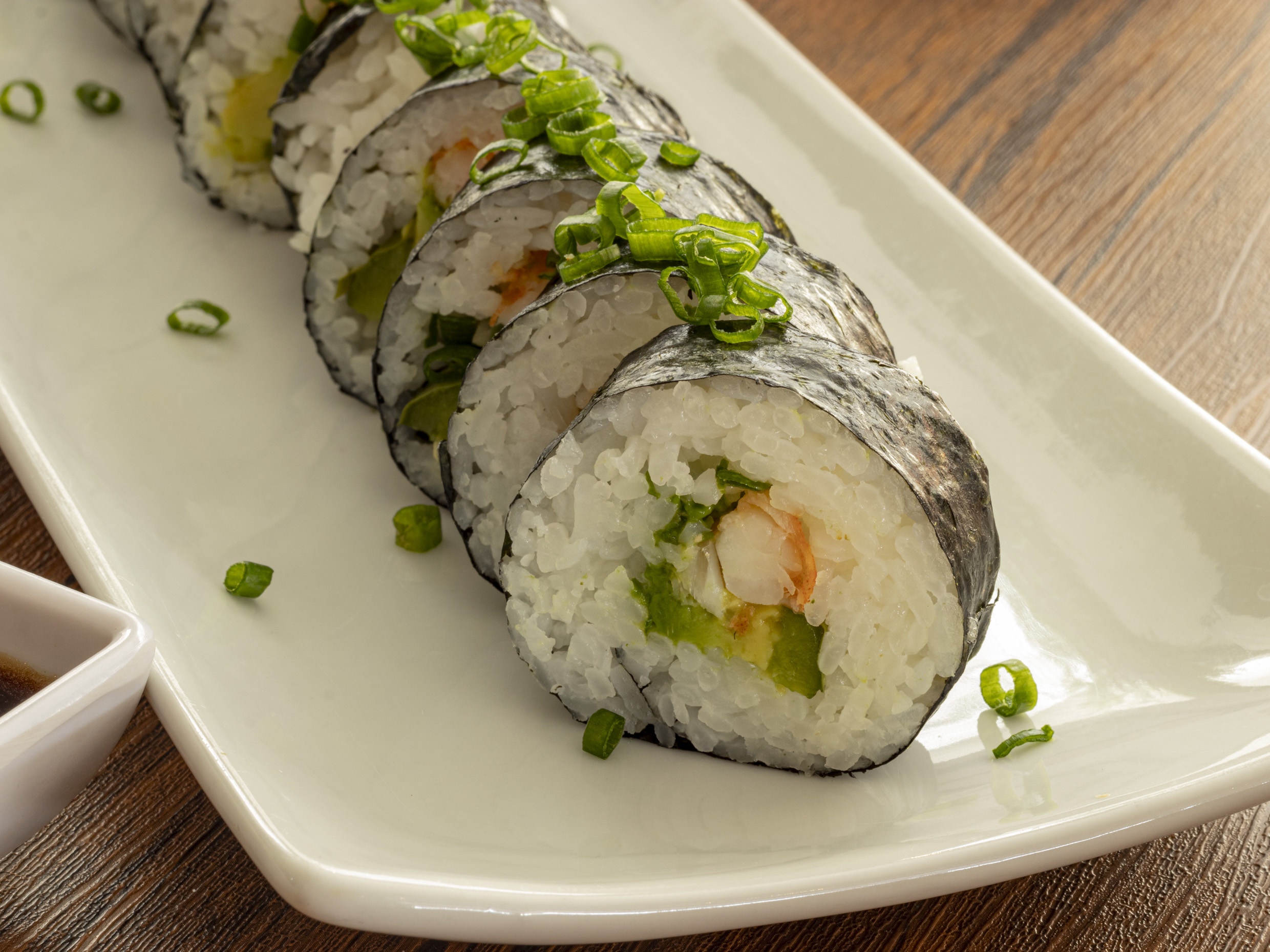 Rollo fresco y con el alga por fuera, por dentro lleva proteína a elegir, aguacate, queso crema, cebollín y serrano toreado.