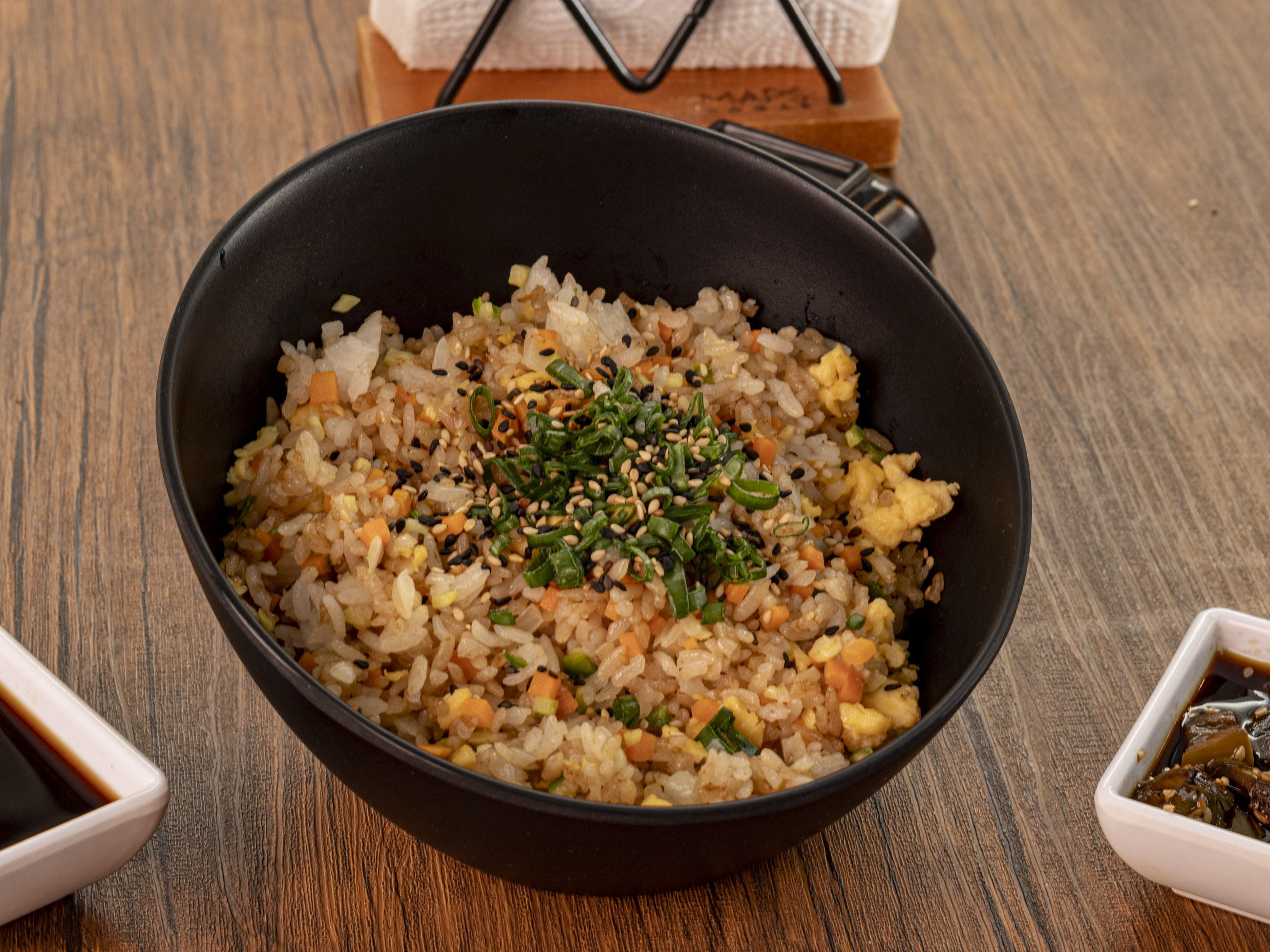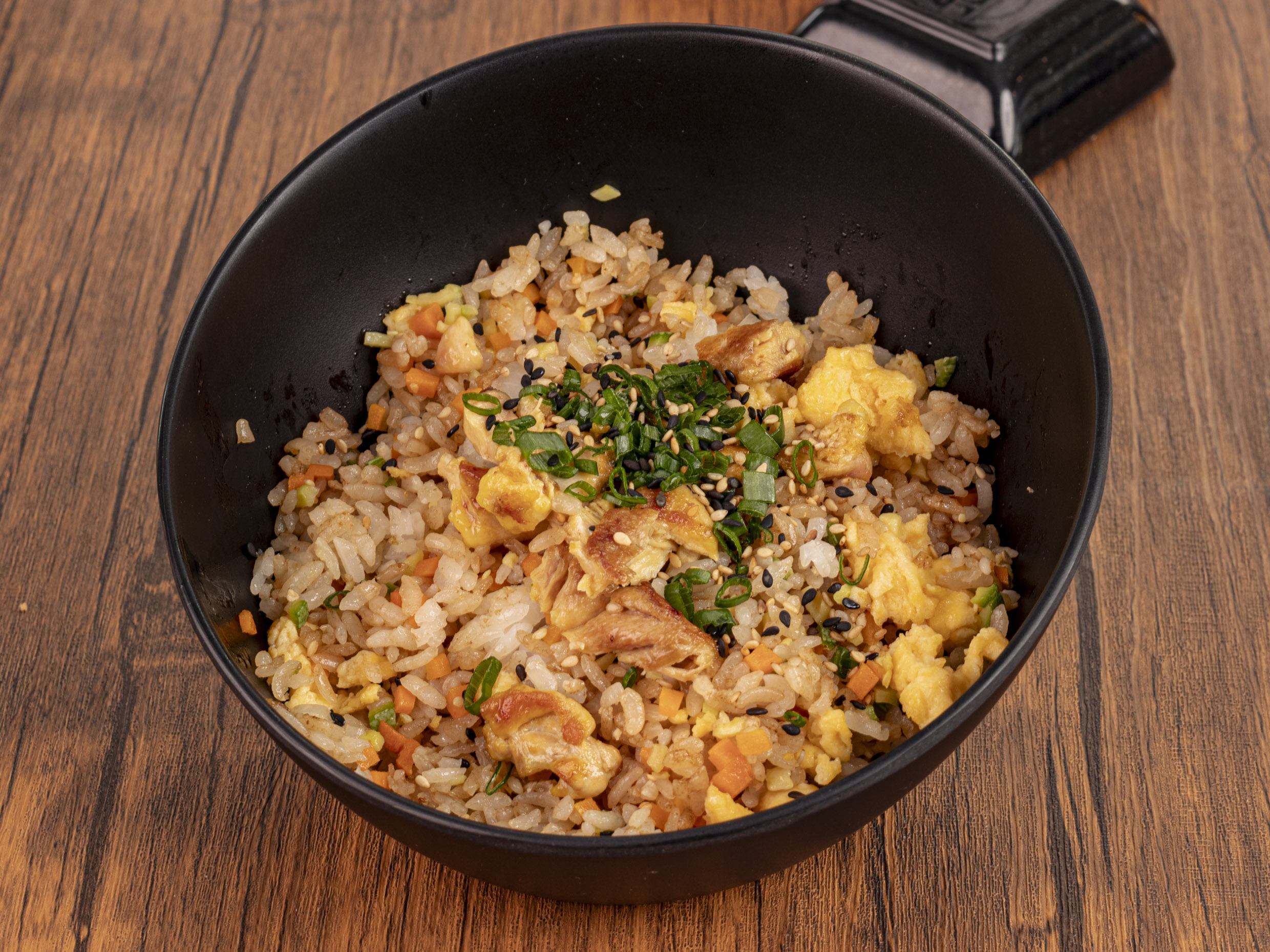 Arroz frito preparado con cebolla, zanahoria, calabaza y huevo. Sazonado con nuestra salsa yaki, servido con ajonjolí y cebollín.