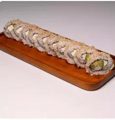 Por dentro aguacate y pepino, cubierto de queso crema. Topping de tampico y camarones empanizados.
