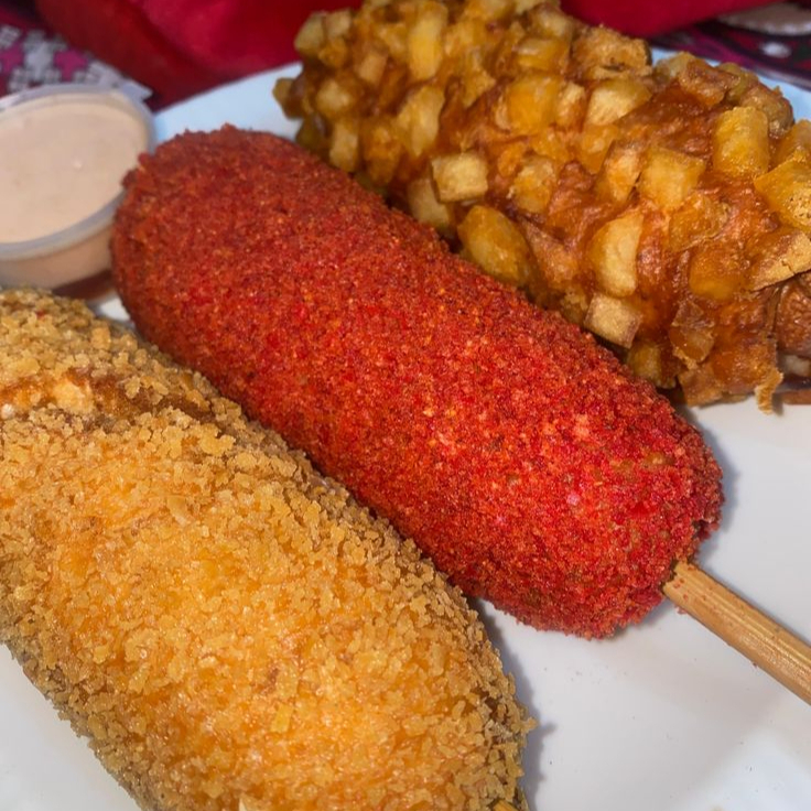Banderilla cubierta con papa y empanizado harina de trigo sal azúcar levadura