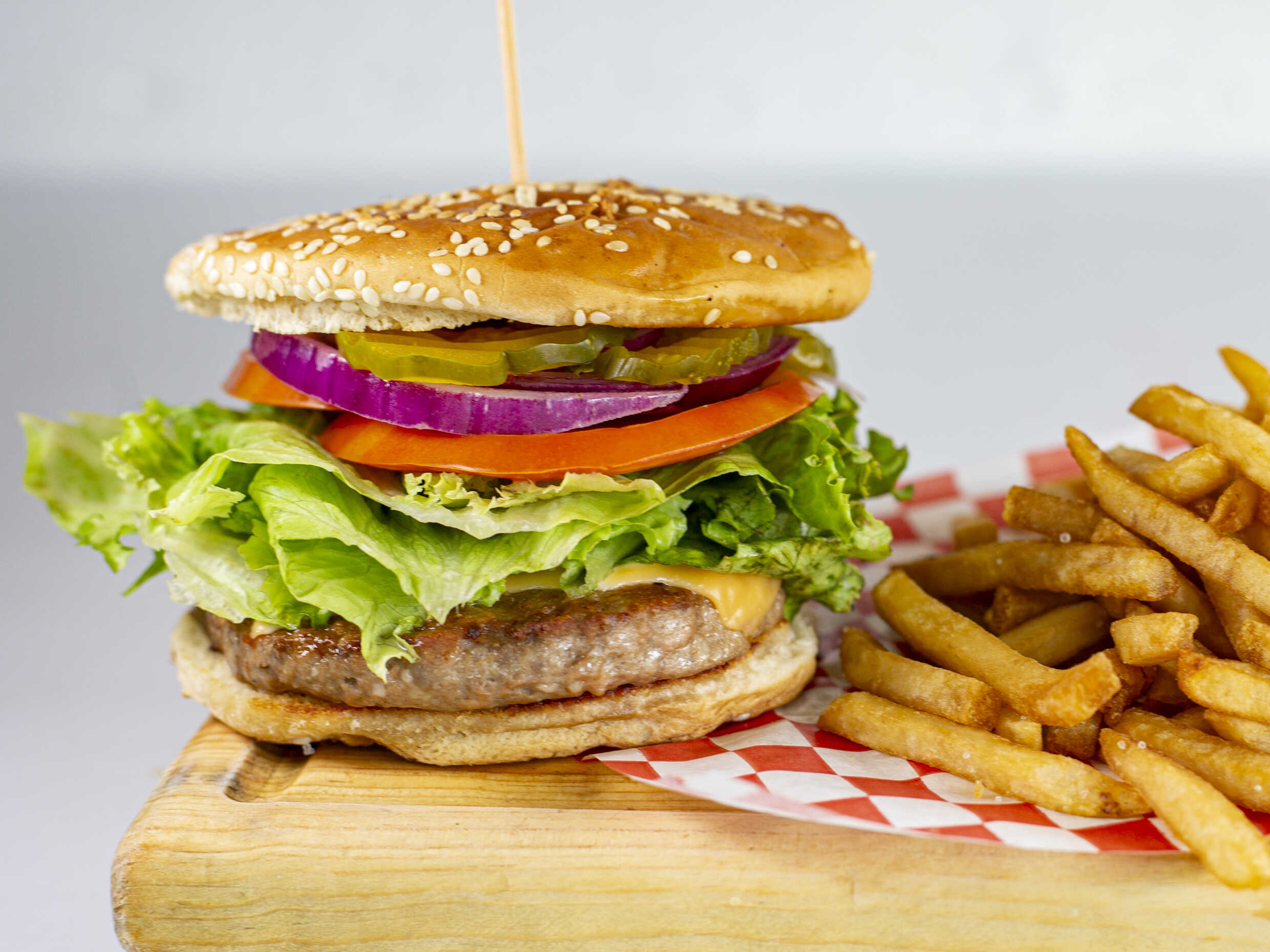 Pan brioche, carne de res 150 g, queso americano, mayonesa, lechuga, jitomate, cebolla y pepinillos.