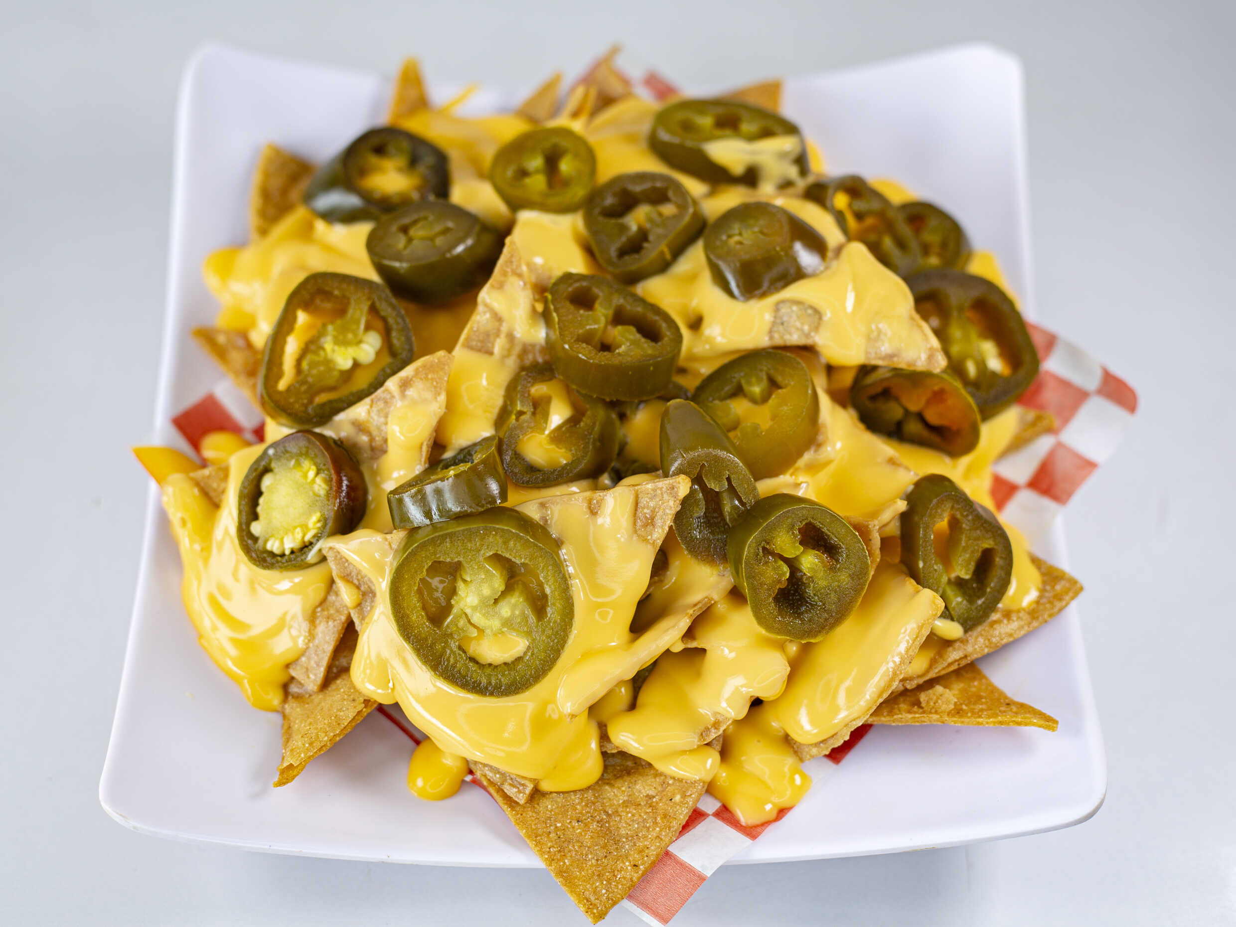 Nachos 120 g, bañados con queso para nachos y jalapeños.