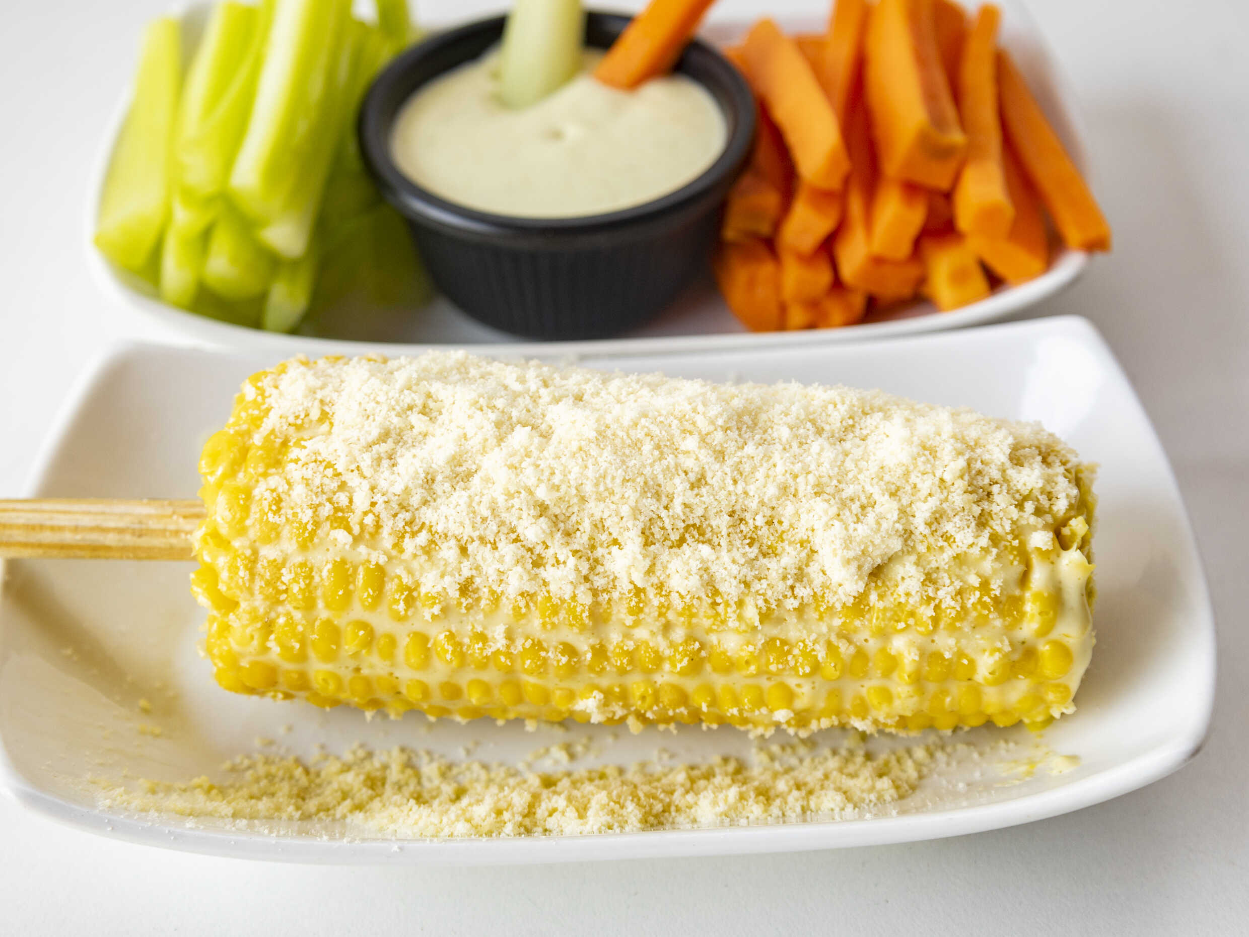 Bastones de zanahoria 85 g, y apio 100 g, acompañados de aderezo ranch 59 ml.