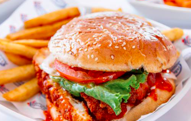 Hamburguesa de pechuga de pollo empanizad bañado en salsa bufalo, + papas a la francesa, 150 + refresco 355 ml.