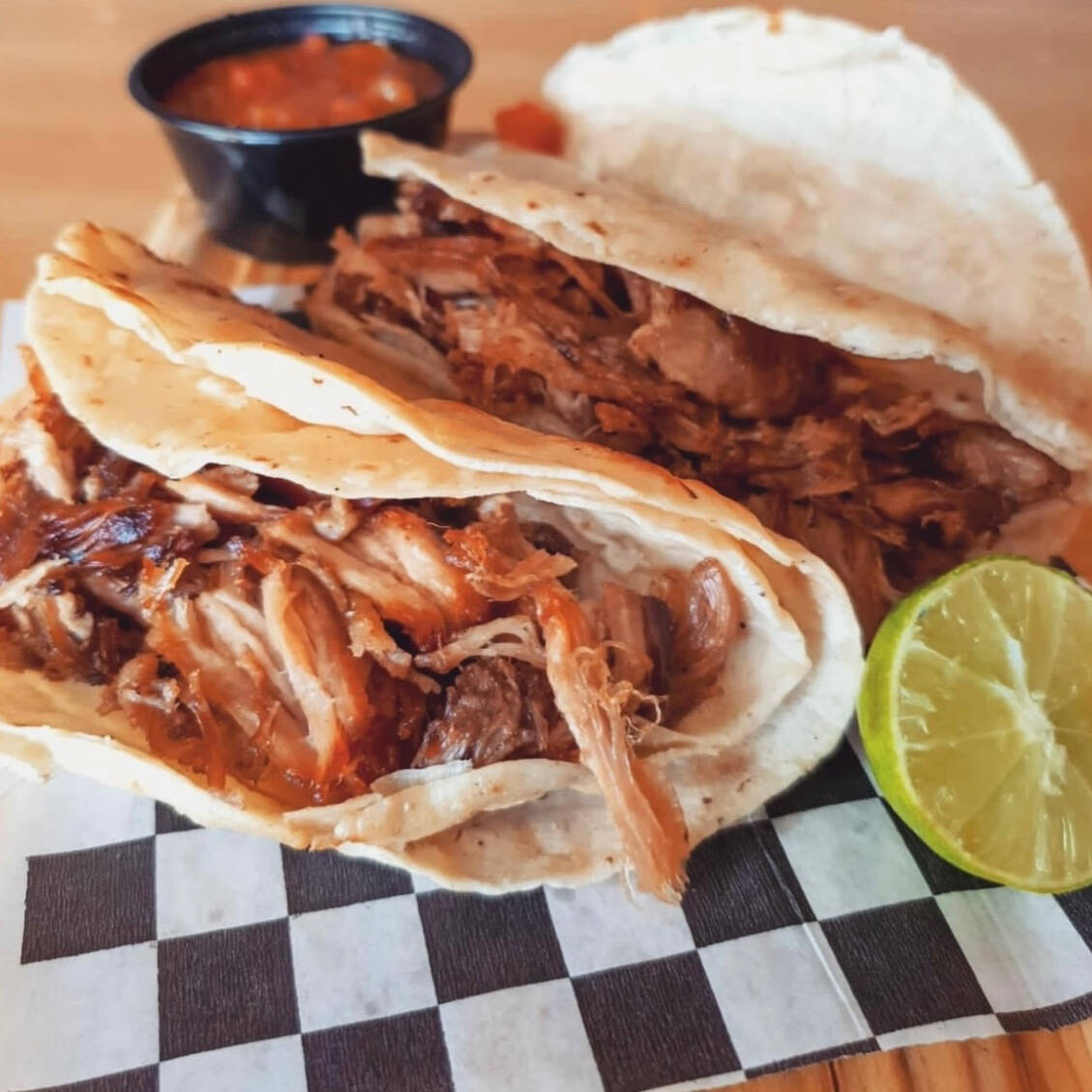 Taco de carnita de costilla de cerdo (35 gr.) acompañado de aderezo de guacamole