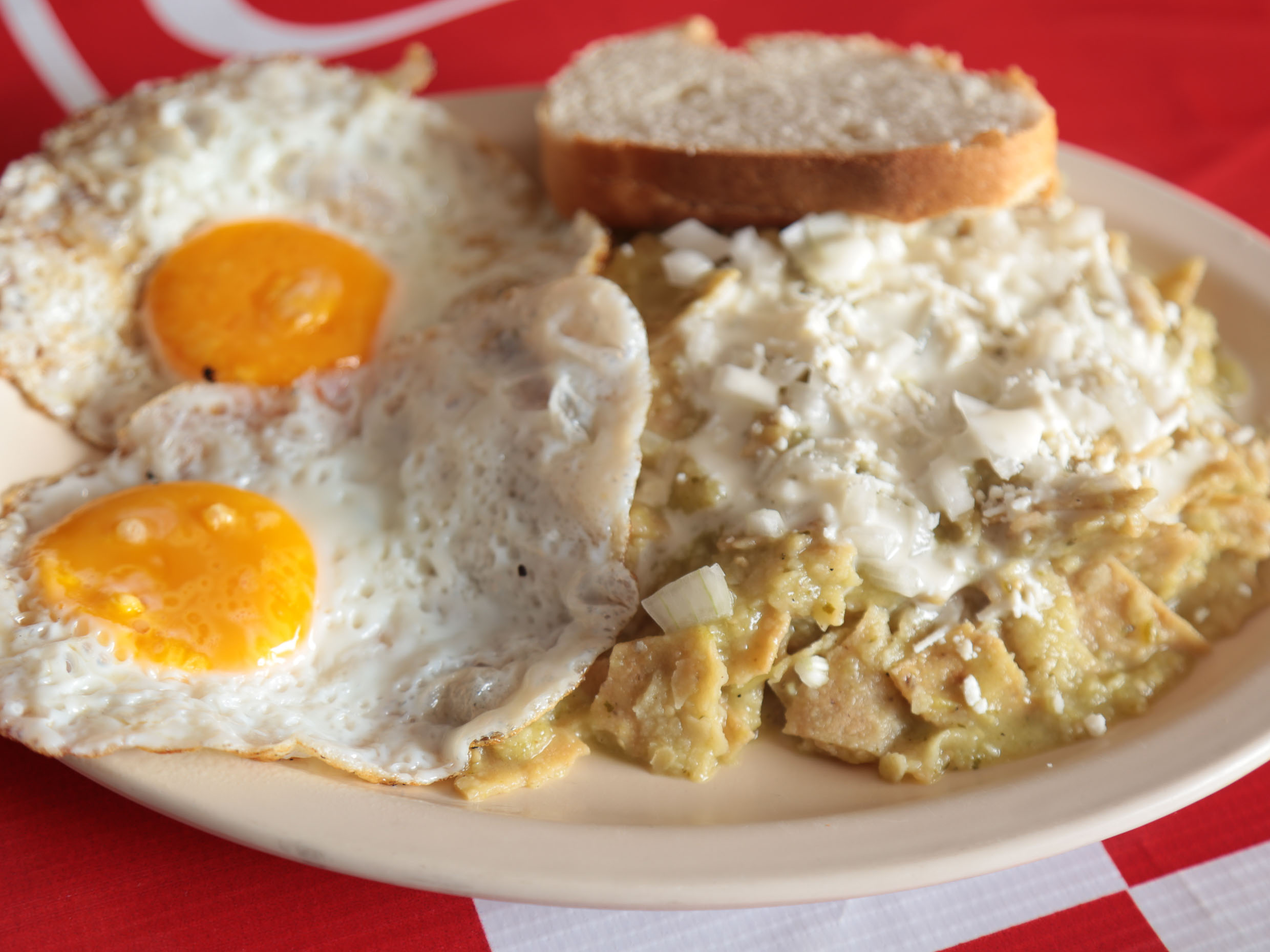 Salsa verde, totopos, cebolla, crema, queso y 2 huevos al gusto