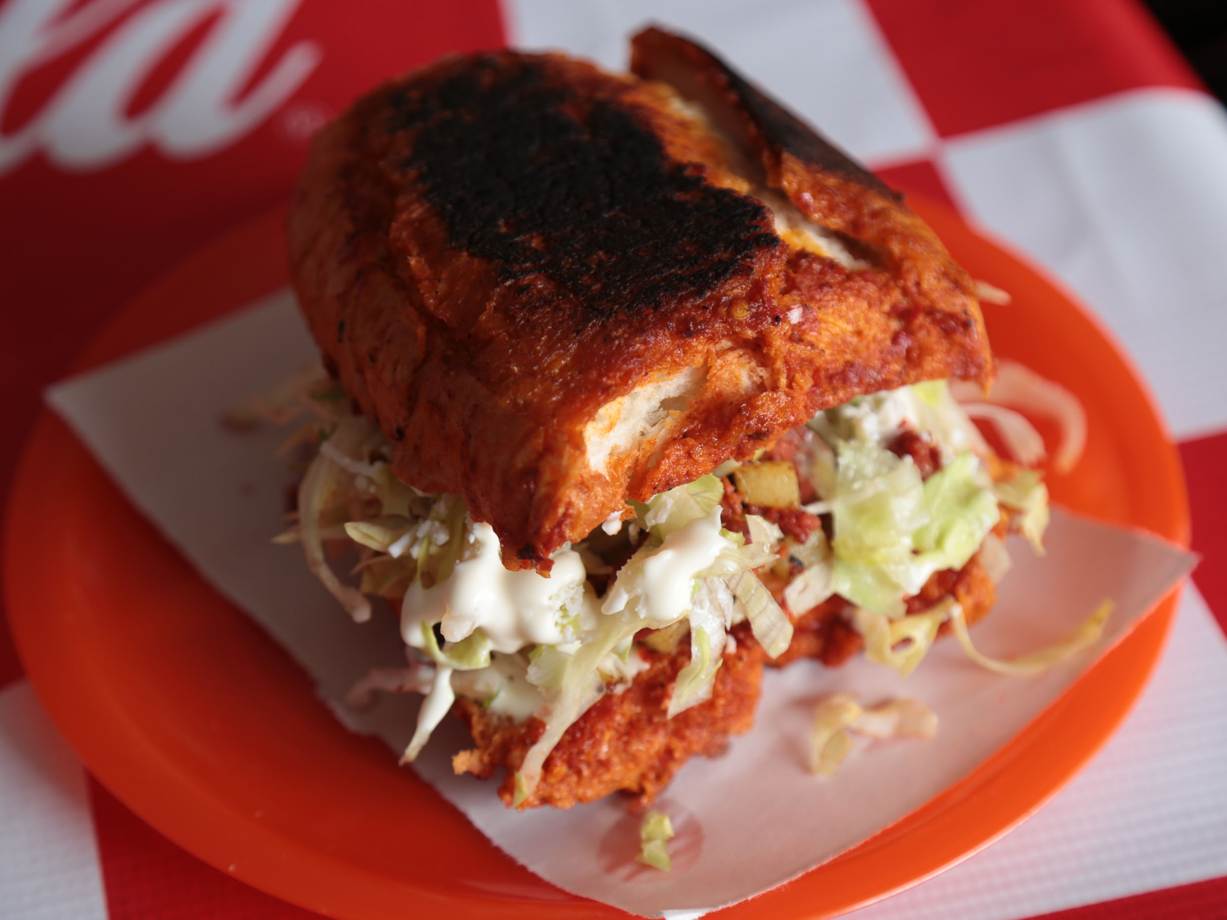 Pan sumergido en salsa de guajillo (NO PICA) frito y relleno de papas con chorizo, lechuga, queso y crema