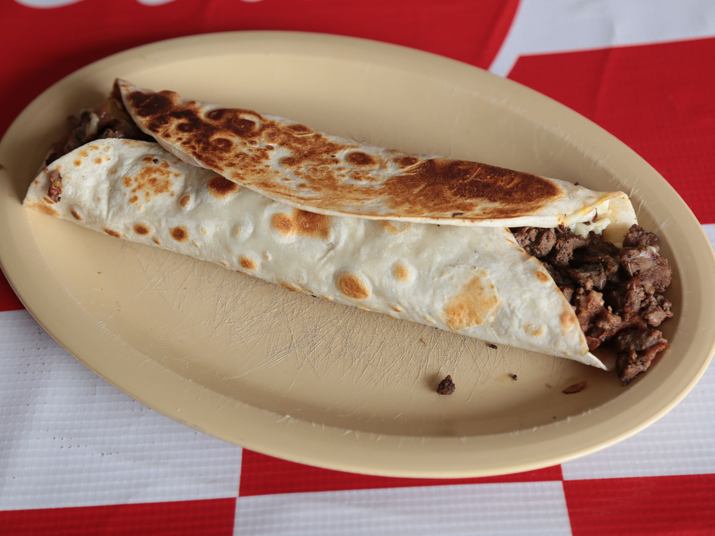 Tortilla de harina, , frijol, queso y bistec