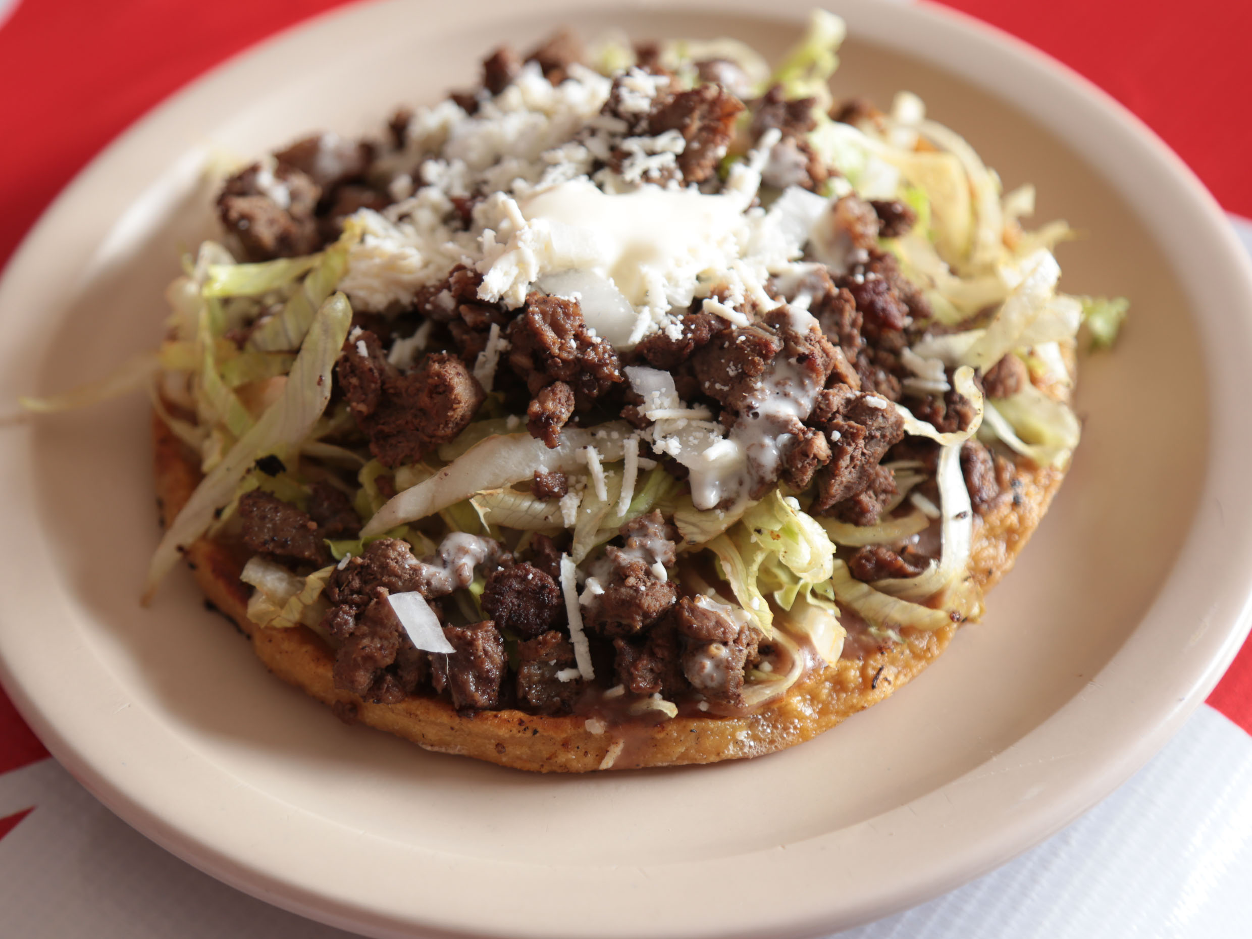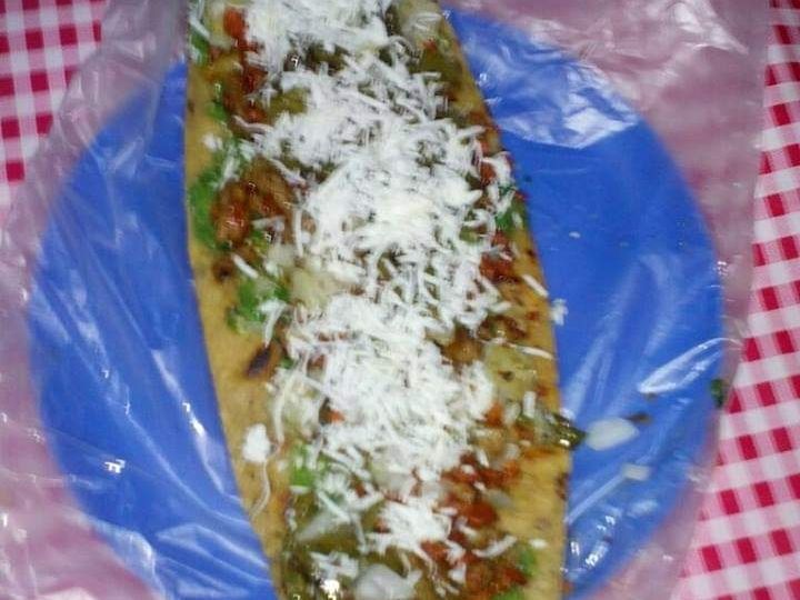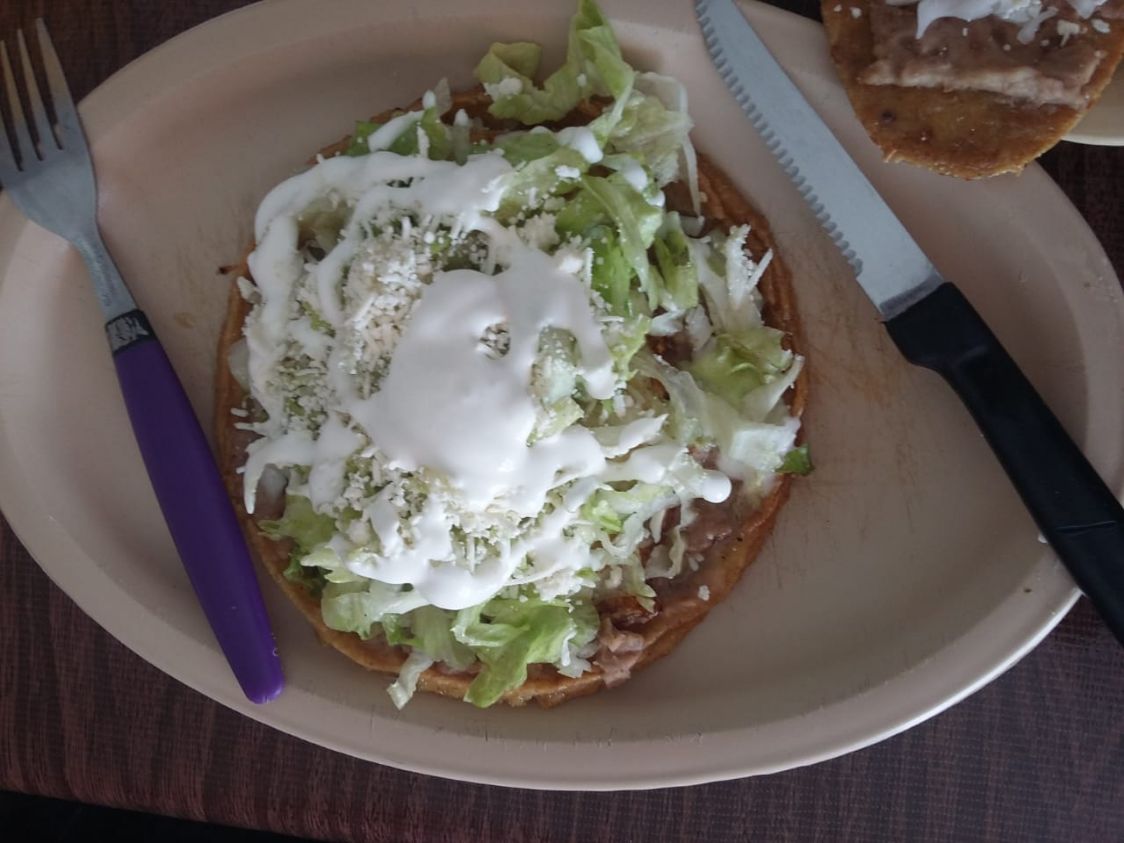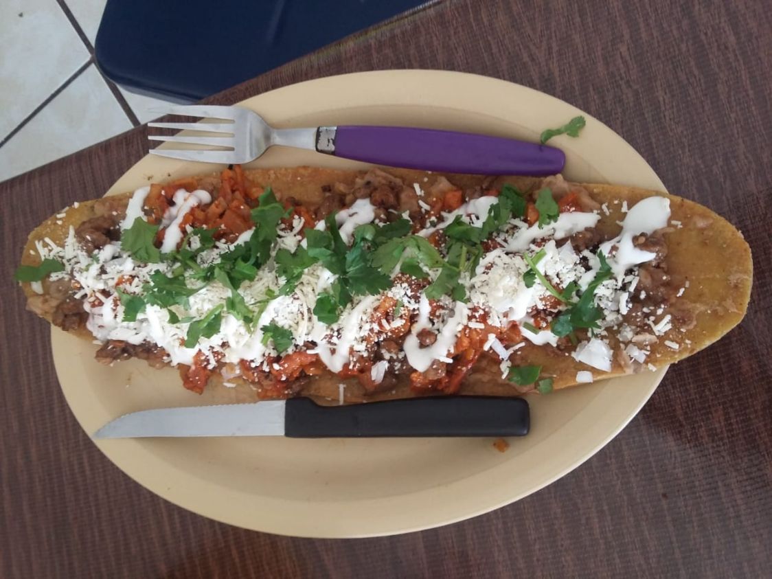 Masa cocida y frita, con frijol, pastor, cebolla, queso y crema