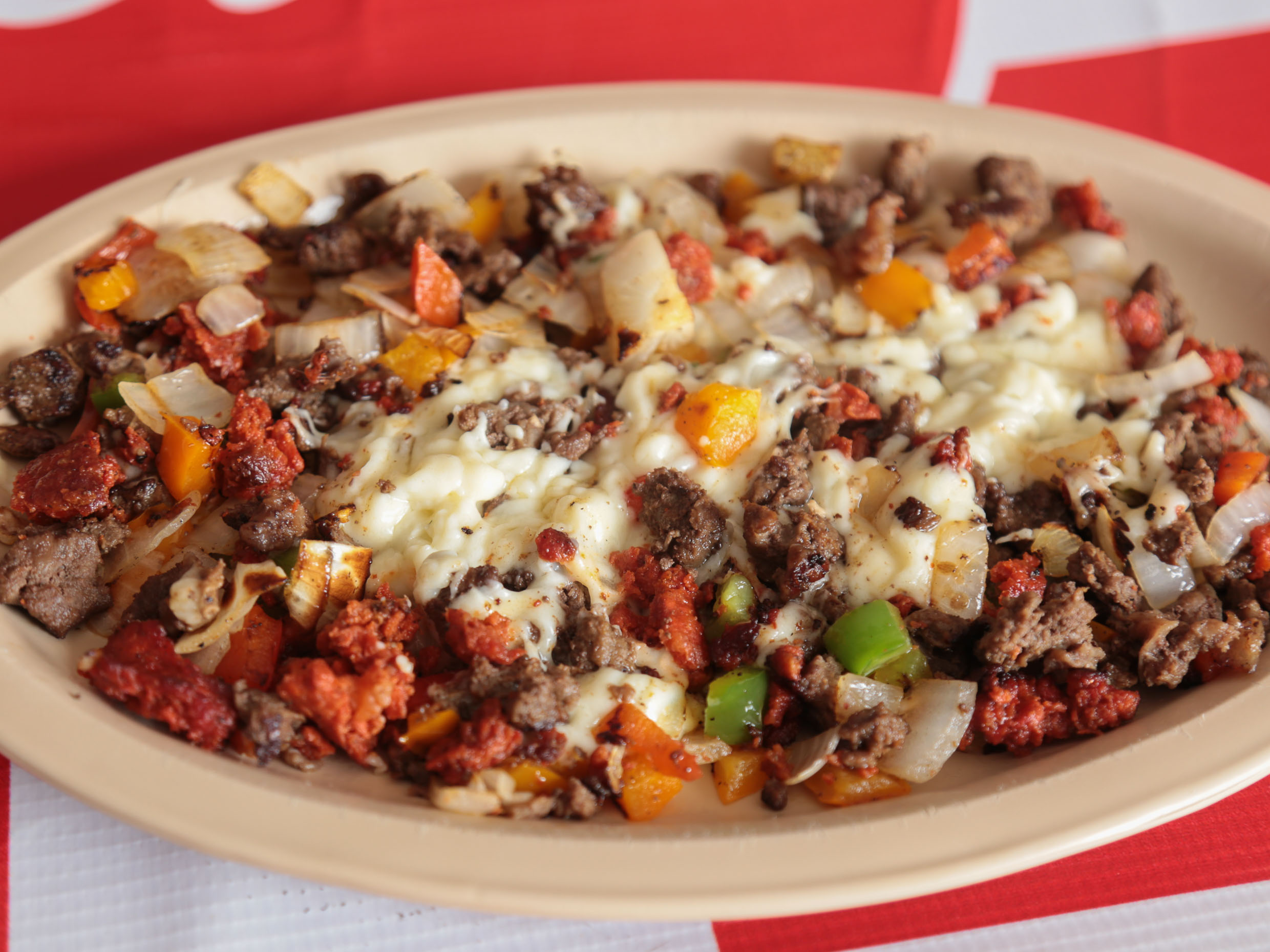 Delicioso chorizo gratinado con queso y cebolla, acompañado de tortillas de maíz y de harina