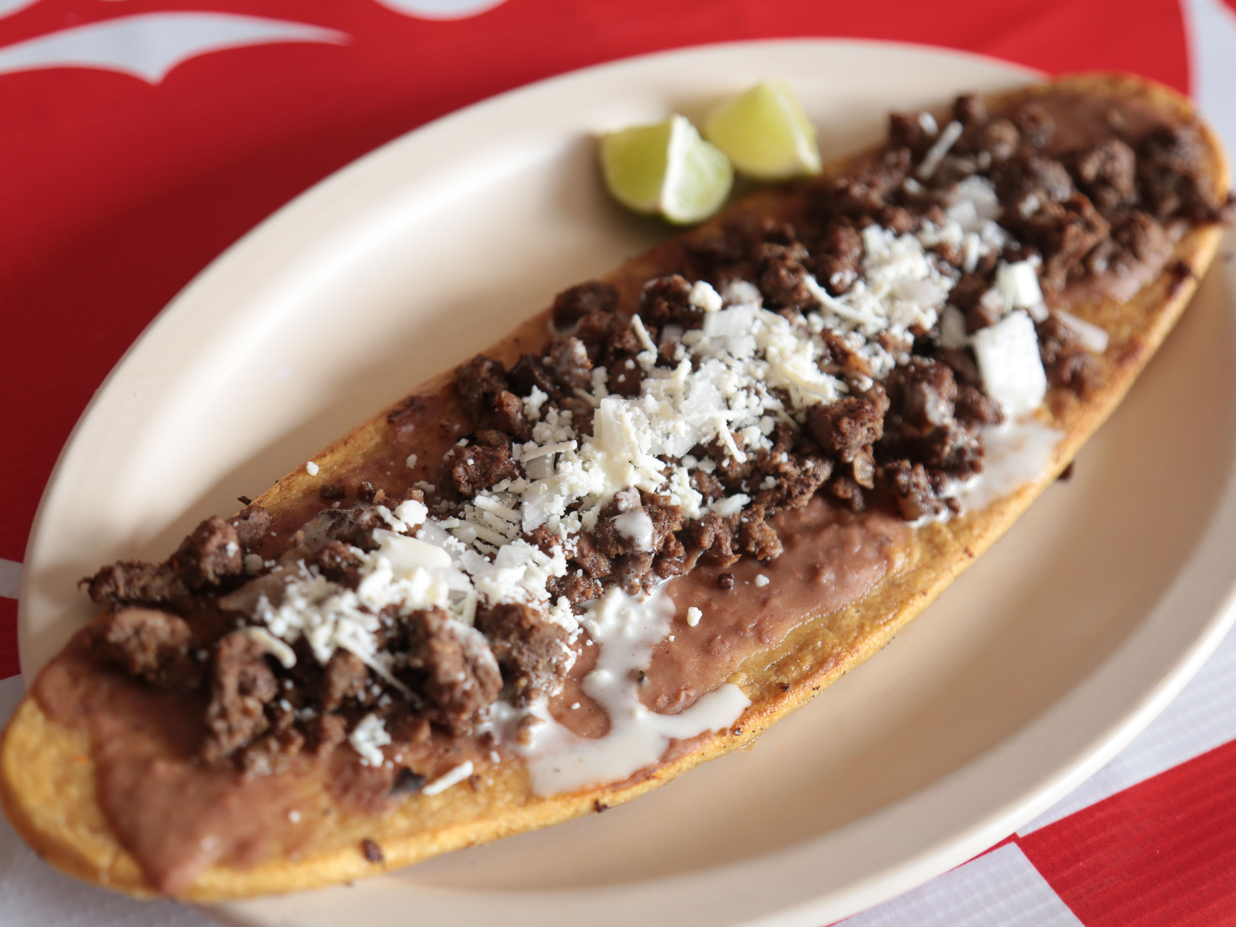 Masa cocida y frita, con frijol, suadero, cebolla, queso y crema