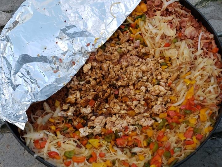 Pimiento morrón y cebolla frita, bistec, salchicha, pastor y chorizo con 12 tortillas