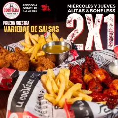 Papas a la Francesa PROM*1 + Boneless de Pollo PROM, con papas gratis*2Bonales de pollo (aprox. 180 g) ×2, acompañados de papas a la francesa (120 g) a elección, con 1 salsa a elegir entre: Taquis Fuego, Flamin’ Hot, Retjot, Mango Habanero, Chips Jalapeño, Doritos de Queso, Barbi Quit, Lemon Pepes, Crema y Especias, Chipotle o Rancheritos.