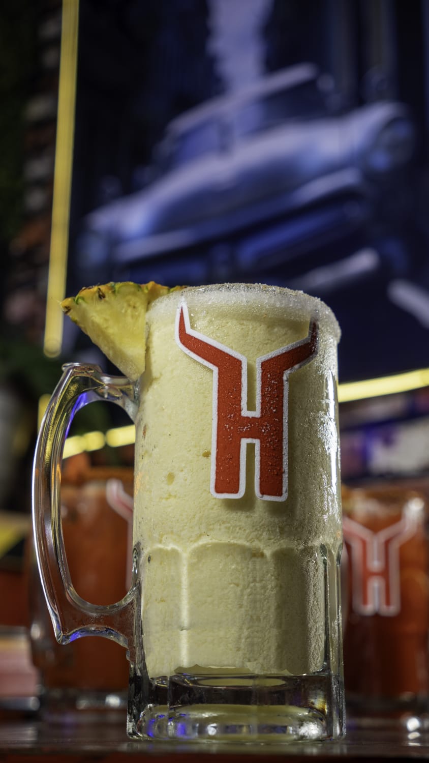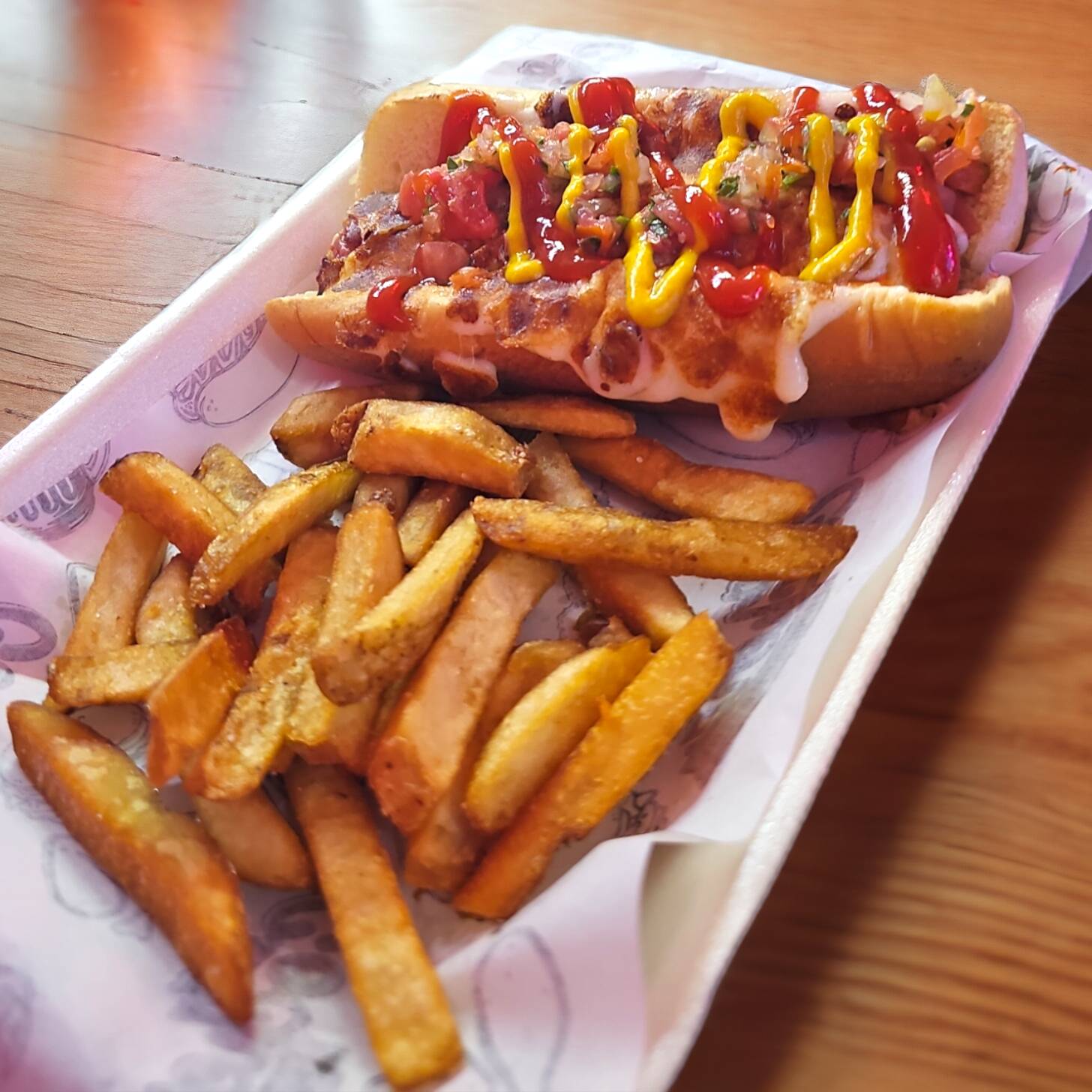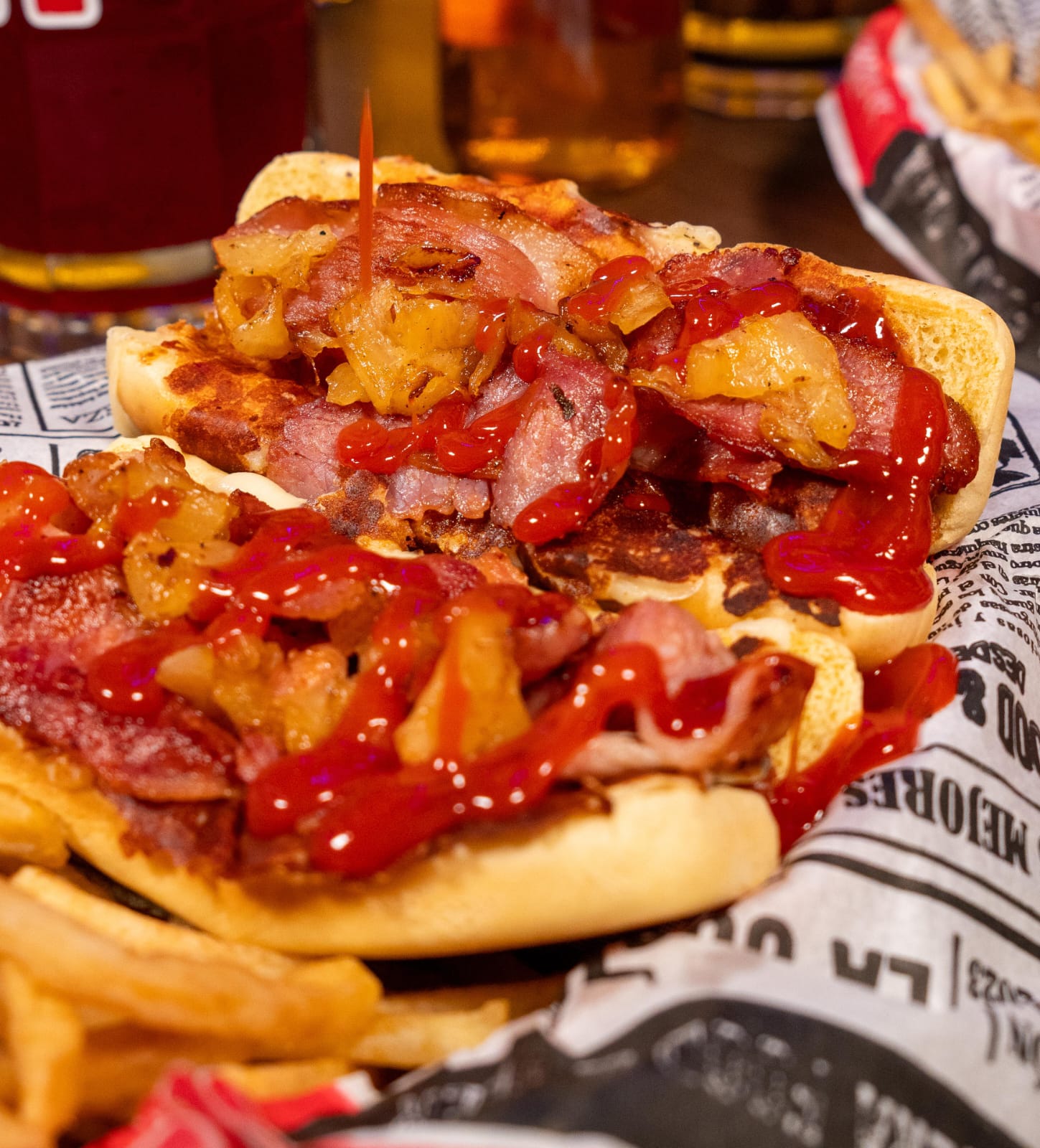2 hot dog con tocino, piña, quesos y papas