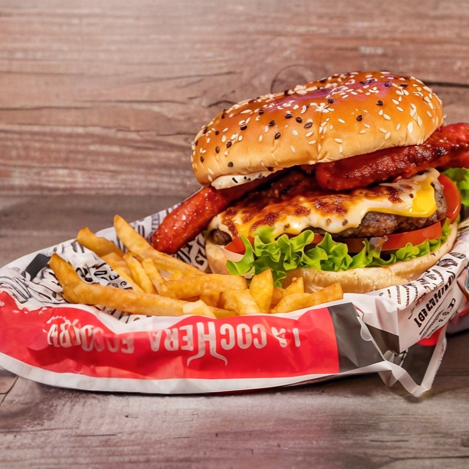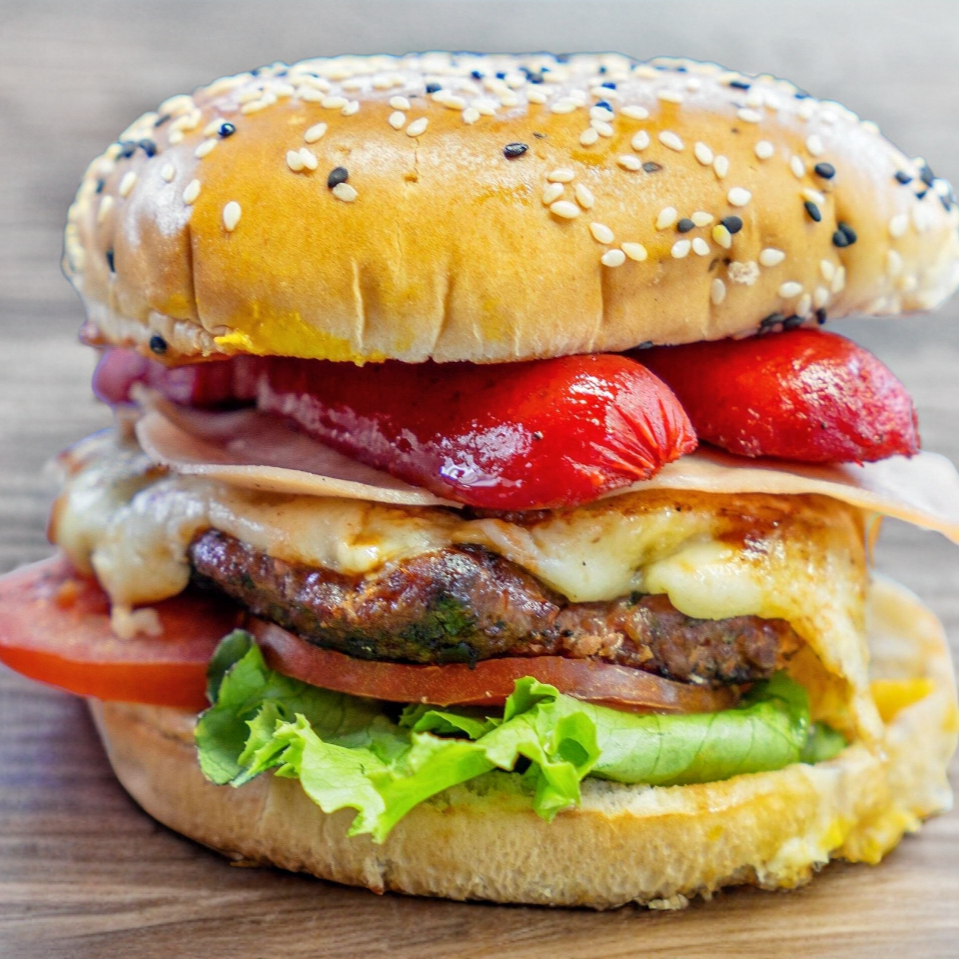 Deliciosa hamburguesa con queso asadero amarillo y chistorra fresco