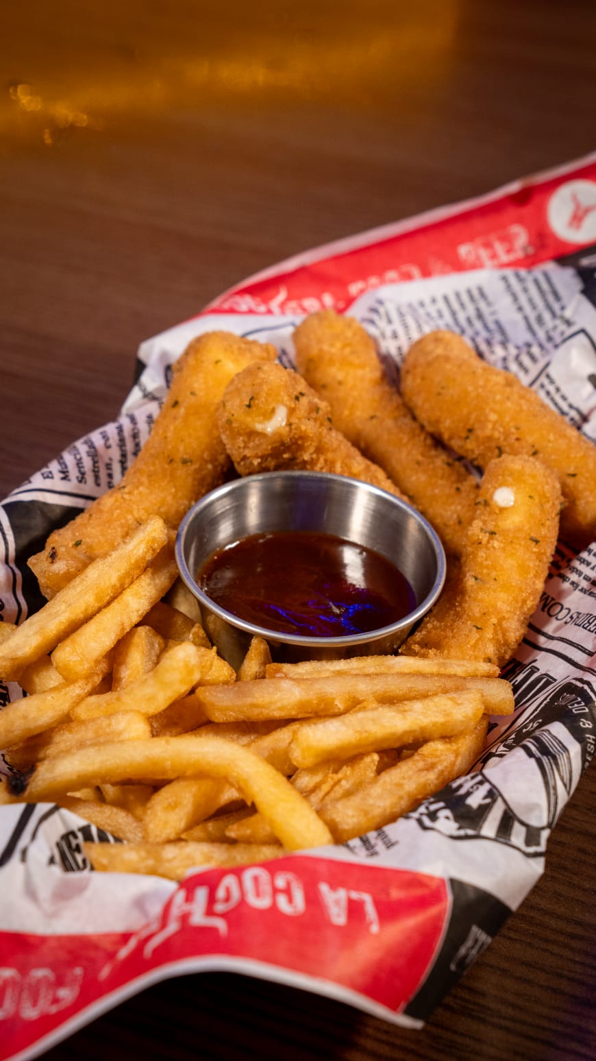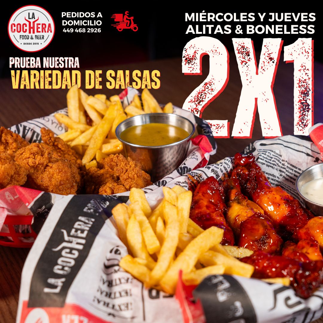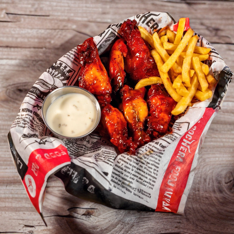Bonales de pollo (aprox. 180 g) ×2, acompañados de papas a la francesa (120 g) a elección, con 1 salsa a elegir entre: Taquis Fuego, Flamin’ Hot, Retjot, Mango Habanero, Chips Jalapeño, Doritos de Queso, Barbi Quit, Lemon Pepes, Crema y Especias, Chipotle o Rancheritos.