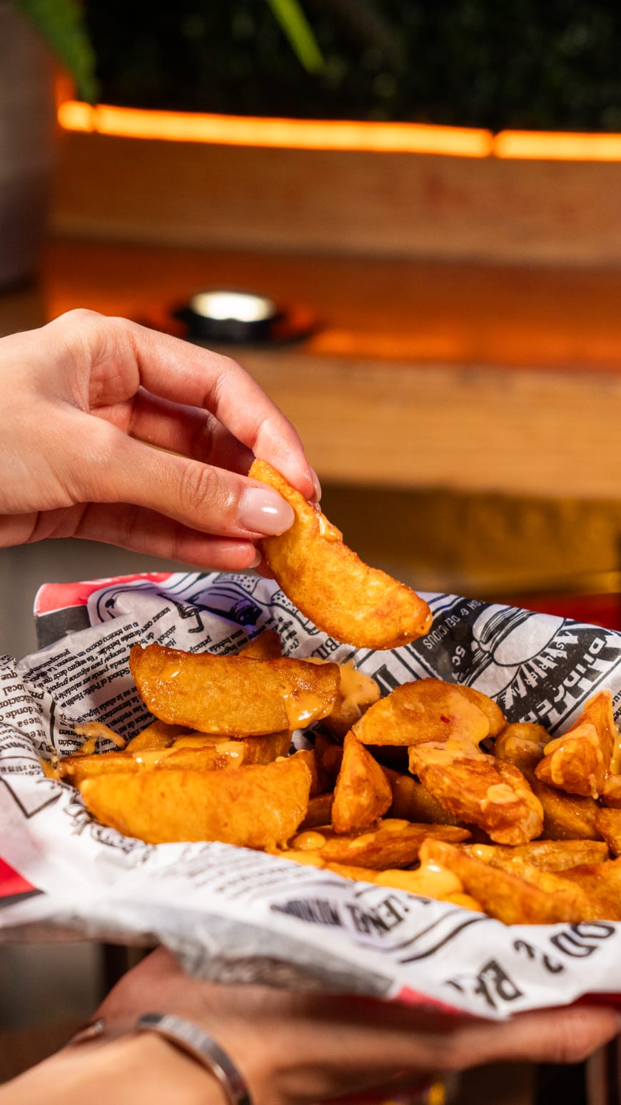 Papas a la francesa bañadas en queso cheddar y tocino, 300 g.