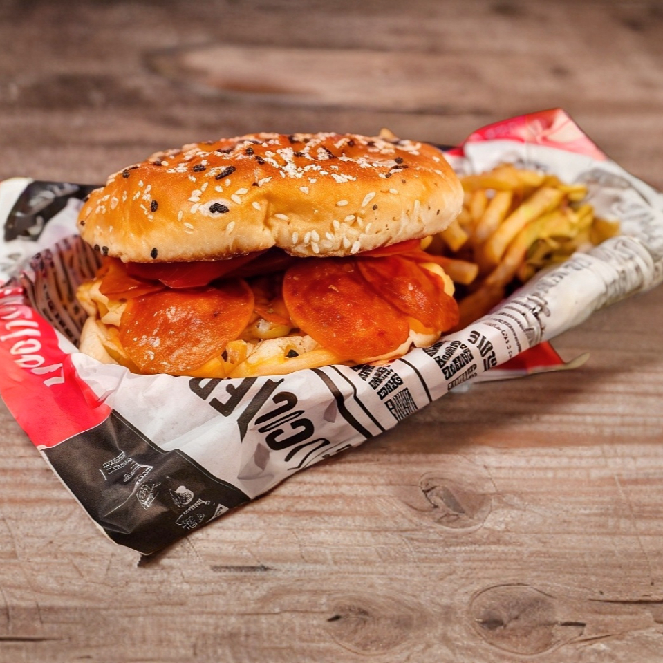 Hamburguesa de res al carbón con queso asadero pepperoni salsa de pizza