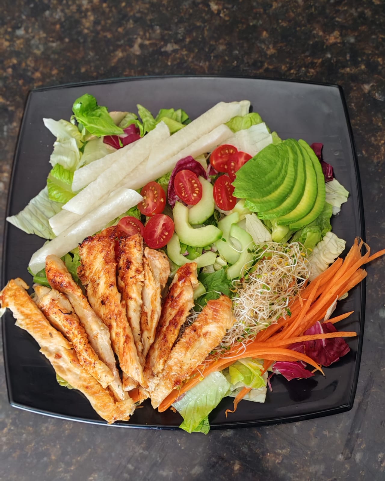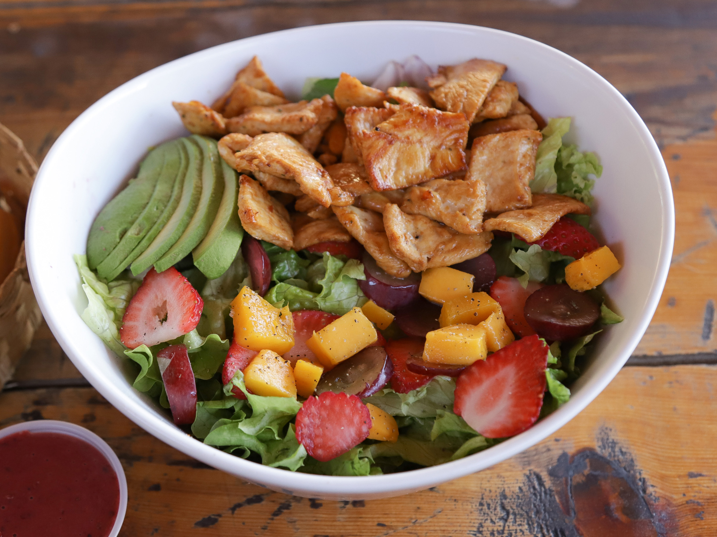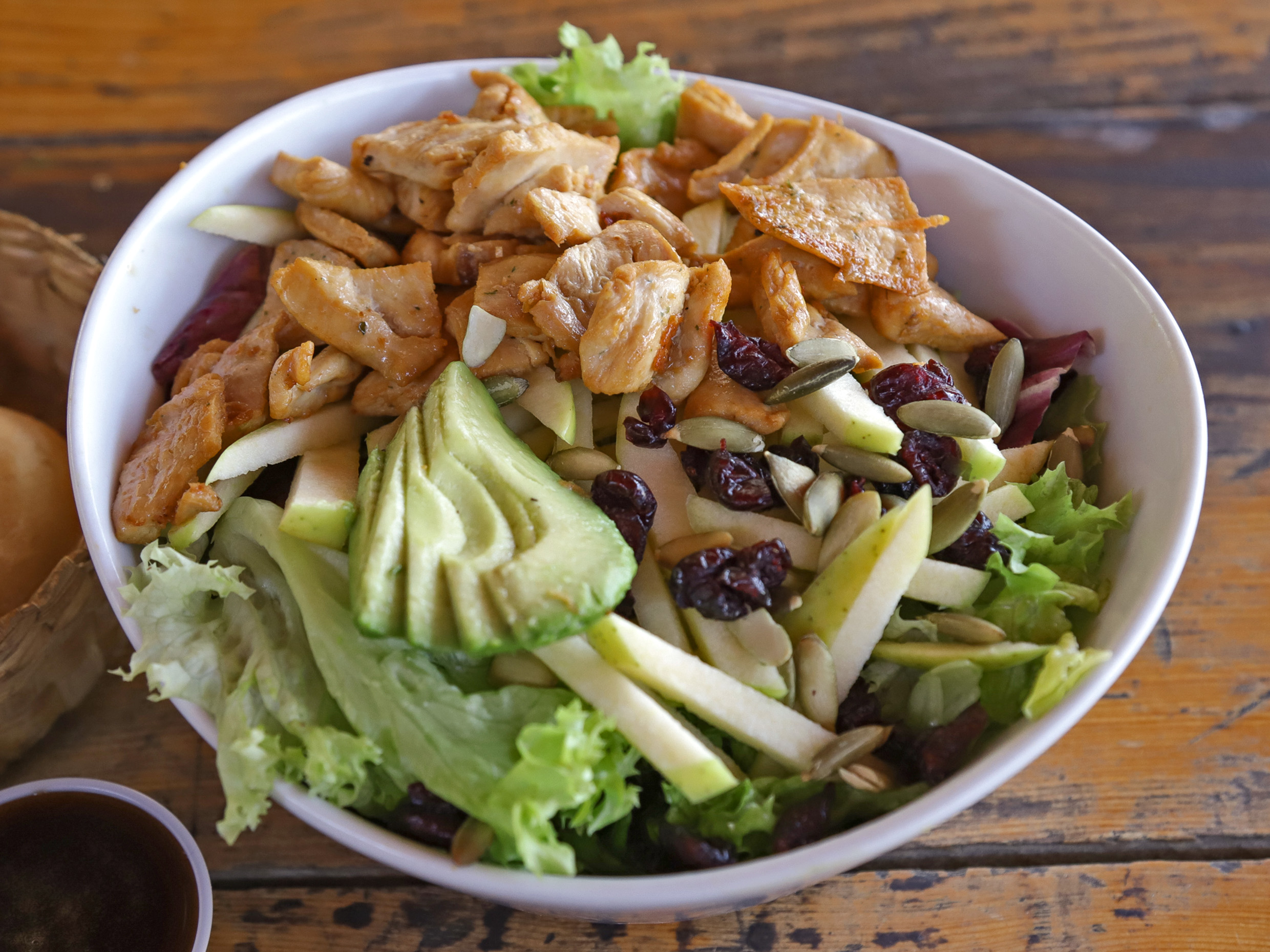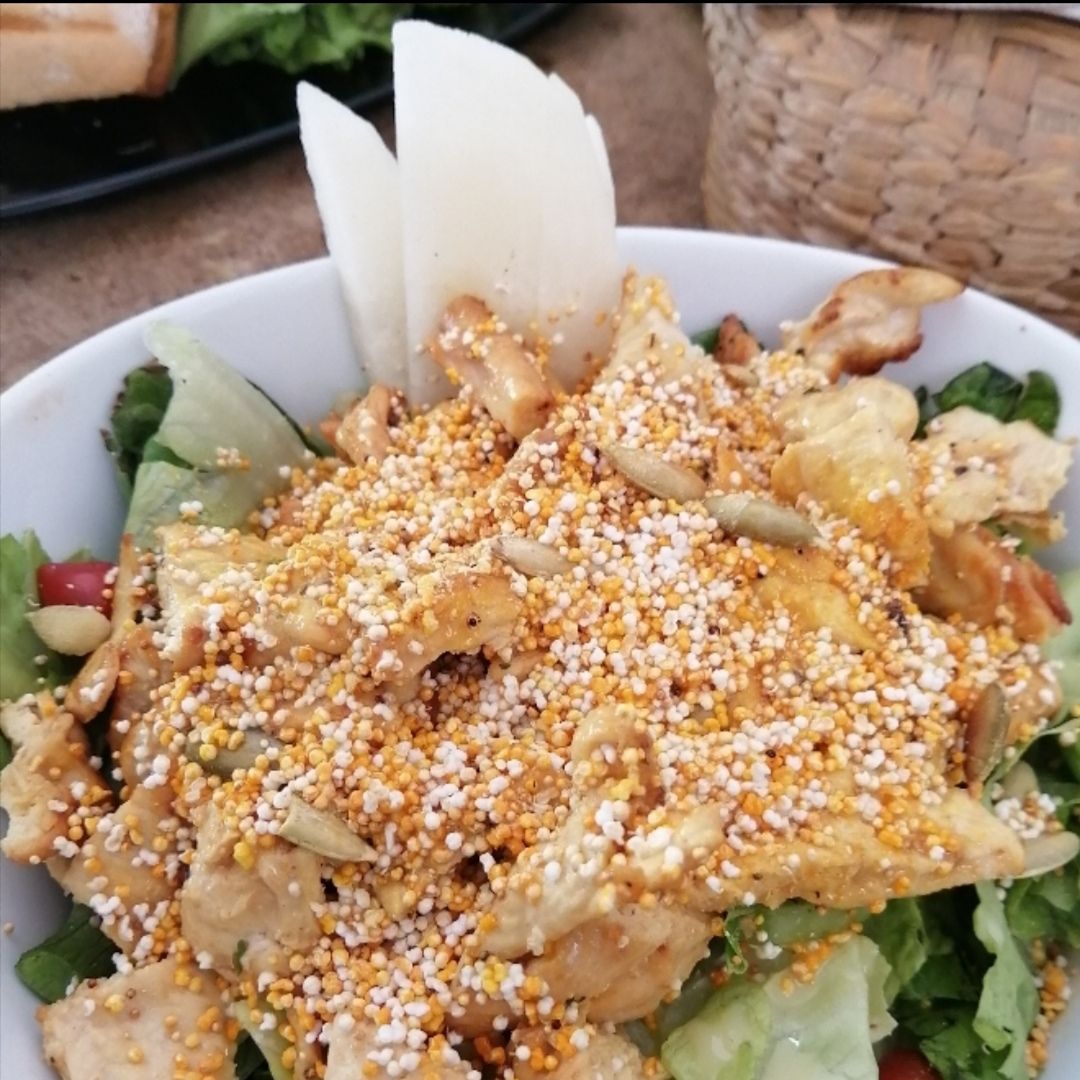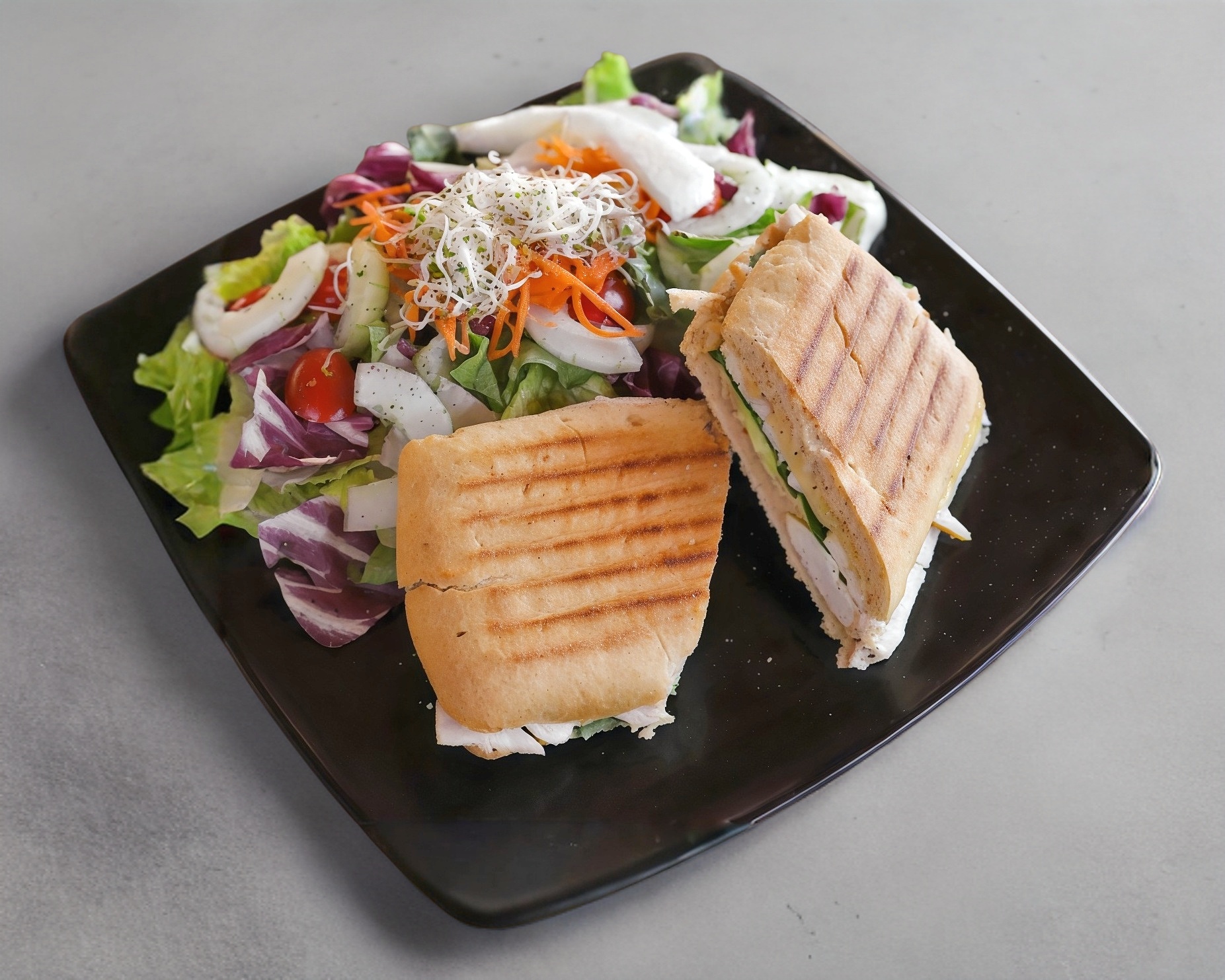 Panini con aderezo de chipotle, espinacas, queso gouda, aguacate y pechuga de pollo a la plancha. Acompañado de ensalada italiana, jícama, tomate cherry, pepino, zanahoria rallada y germen con aderezo artesanal de albahaca para la ensalada.