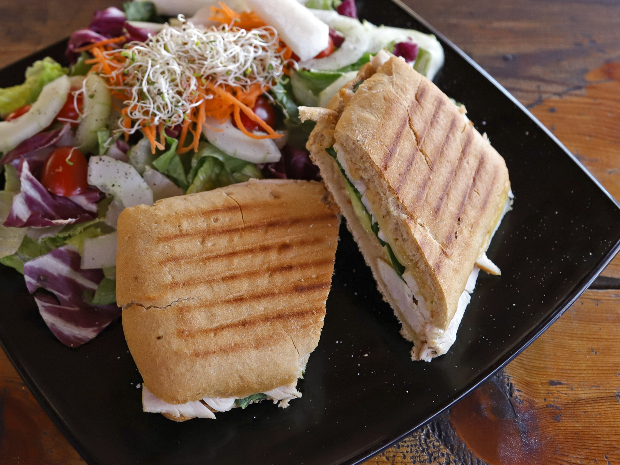 Panini con aderezo de chipotle, espinacas, queso gouda, aguacate y pechuga de pavo a la plancha. Acompañado de ensalada italiana, jícama, tomate cherry, pepino, zanahoria rallada y germen. Aderezo artesanal de albahaca para la ensalada.